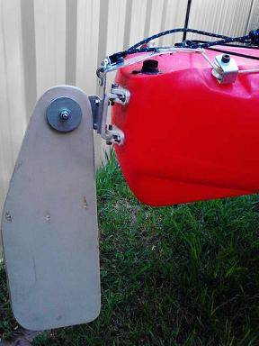 The rudder mount is just two plastic bimini hinge mountings fixed to the rear of the sit on top via four S/S bolts supported inside the hull by a largish PVC square plate. To assist assembly I had to drill a 25mm (250mm ??) whole which I filled with a standard Kayak bung after fixing the rudder mount. The rudder assembly is made from PVC and 3mm ally which supports the ply rudder between two 50mm circular plastic damping washers.