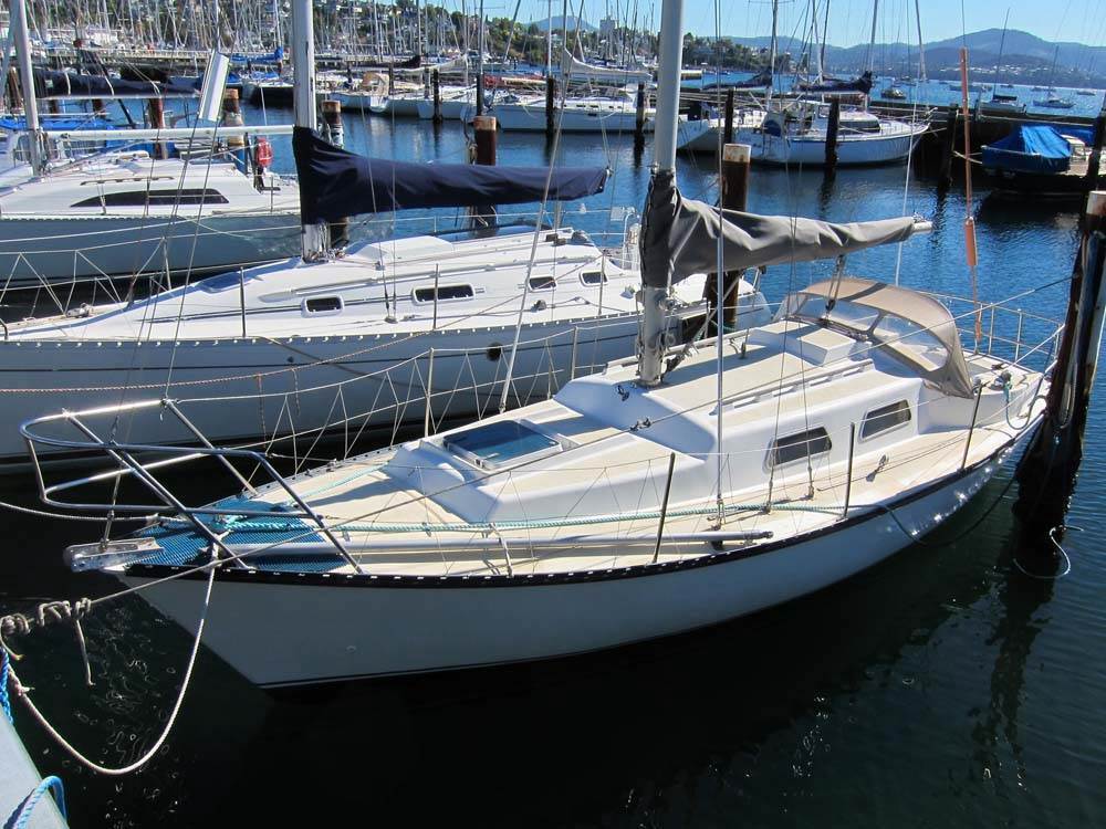 Hi Don and Sylvia, as I said she was lying at Port Huon (coincidence)and I took deliverys at muirs who checked her over,fuelled,fitted compass which I swung at the Garrow light.She had the grp moulded interior and was otherwise pretty bare.Idid the fit out which suited our family of 4,the 2 girls I taught to sail and later Igave them a sabot.both competent helmsgirls at age 10 and 12 yo.I made the new tiller,celery,and fitted the spinnaker winches imported from Melb.Also had a no1 made,she'll make 6 knots to windward,hull speed is about 7/8 knots tho in Bass Strait races has surfed at12 knots for 22 miles.(good fun) My permanent crew and self have sailed Tamar to Devonportrace,return following day.Barenjoey, 20day island.8miles seaward and return (line honours)she"ll outsail compass 28/29s.Doven 30setc.We used 2 sail tracks,heavy and light weather,. Now I must say there is a misnomer,when people call 845s anH28.they are a Hereschoff,Khan Walker took some lines off them ,but from the waterline down the845s are totally different,deepkeel draw just under 5" the H28s are a long keel with skeg and wouldn't sail out of sight in a fog!!!!!!!!!!! Not much else to tell,very successful 2nd Div yacht ,probably 3rd in Hobart as there are more competitors.The photos show she looks to be one of the cleanest yachts Ive seen including the Yanmar which is a 15 HP high speed lightweight diesel will run to 3000 grand but is very happy at 2500 /2700.I also put the two blader on aand when racing ,fixed it vertically behind the keel.All the best will mail down some photos soon. Good Sailing Regards Dave