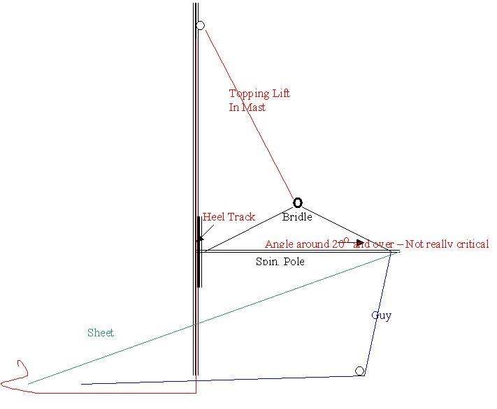 This is the sort of set up show before, but no need for the bridle on the pole, the for guy runs through a bock on the bow to hold the tack down and runs back to the cockpit, when you gibe you end for end the pole, which I reckon is easier if you are short handed, if you want to dip pole gibe you really need a lazey brace which is a bit of over kill on a boat your size , so your sheets should really be made up of 2 rope attached to 1 snap shackle the brace could be say 10 mil and the guy 8 mil.