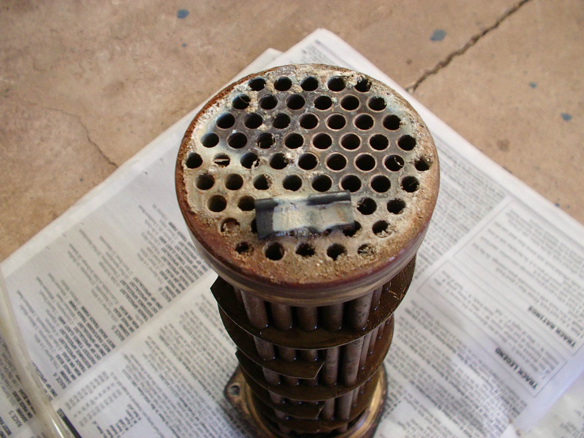 I pulled the heat exchanger out of my 3YM Yanmar today. I was tracking down a missing blade off the raw water pump impeller. Had to remove the alternator and in the limited space around the engine that task proved a little challenging. I found the missing blade at the entrance to the heat exchanger but when I saw the crud that was collecting in it, I figured it best to remove it for a clean.