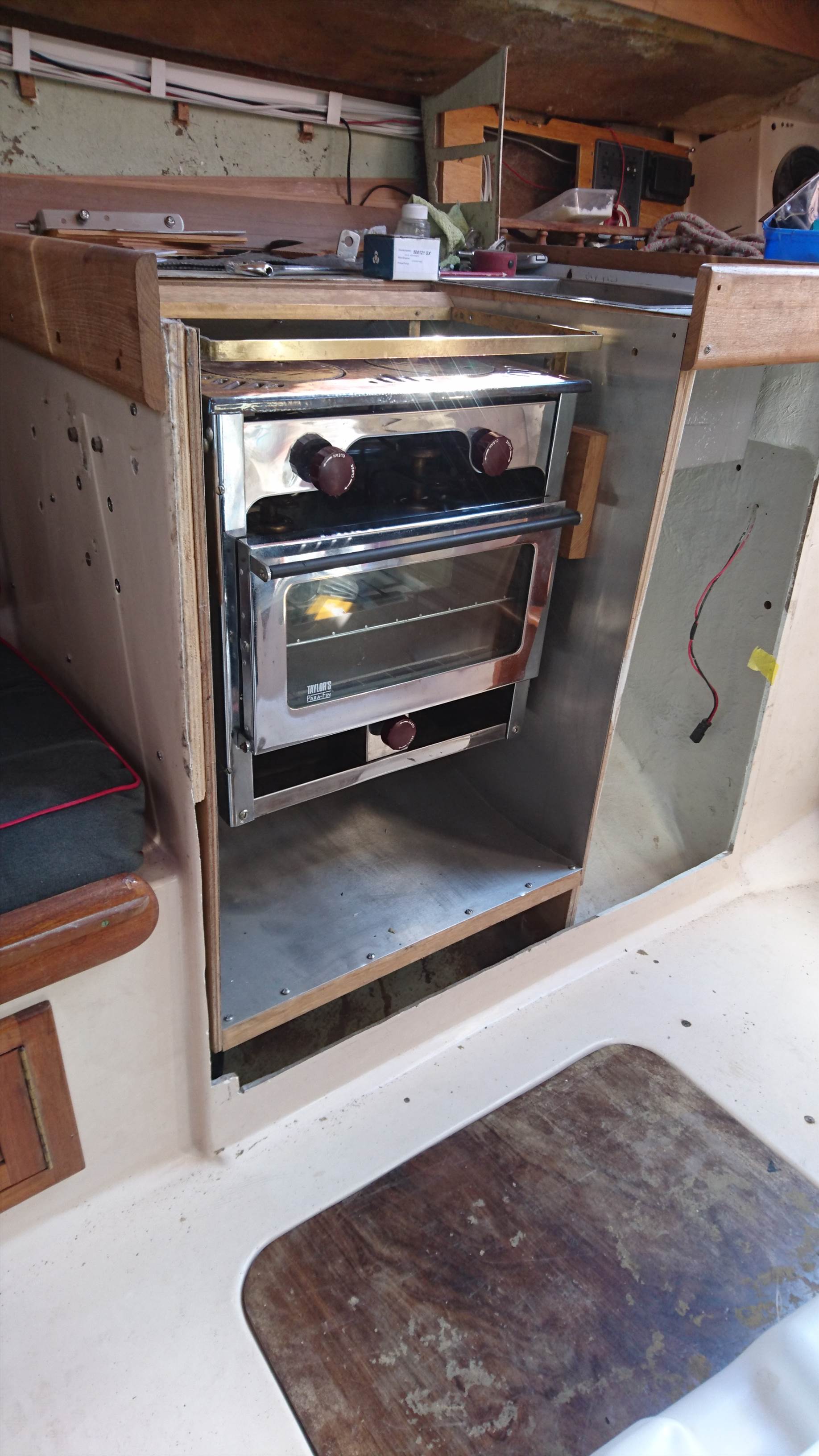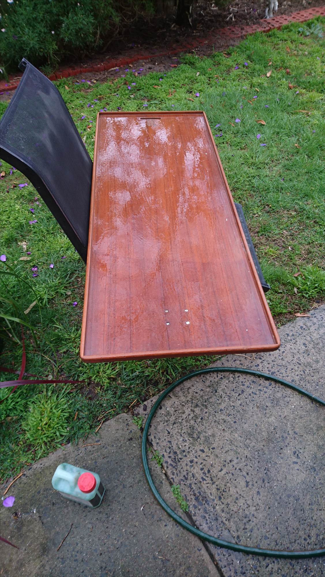 Mounted the stove back into the boat and brought the cabin table home to see if it can be used in the cockpit mounted off the steering pedestal and it will work just fine. So I gave it a sand and hose off then scrubbed it with Feast Watson wood cleaner and pressure wash it after 20 mins.