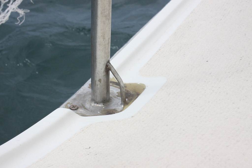 Today with SWMBO's help I got the repaired stanchion fitted, now waiting on the 3.2 mm lifeline from Whitworths. From Clark rubber got a sheet of rubber about 3 mm thick with adhesive one side. Cut that to fit and after cleaning all he old silicon off the deck applied fresh silicon and bolted her in place. Looks so good I will have to re silicon all the other stanchions.