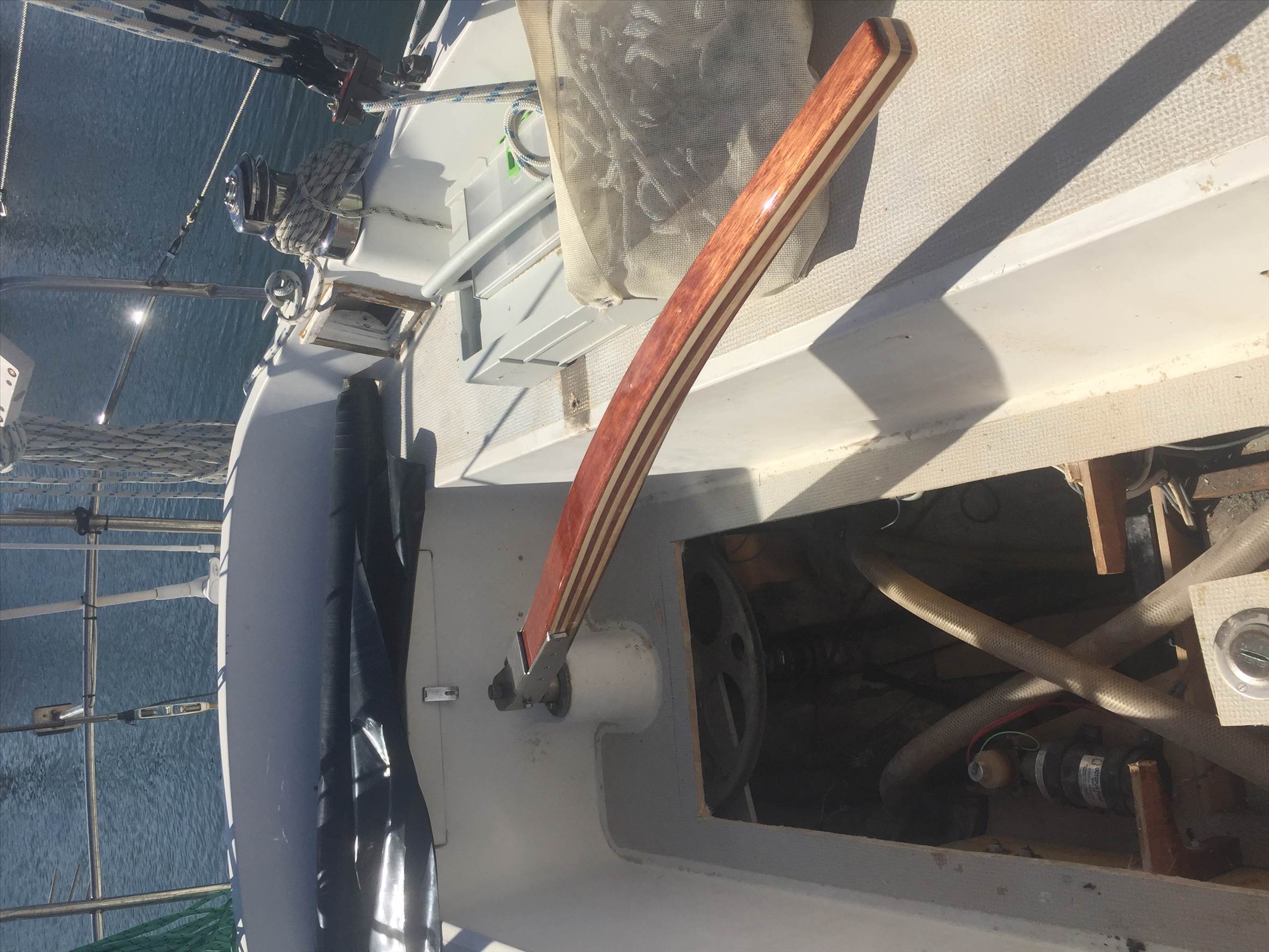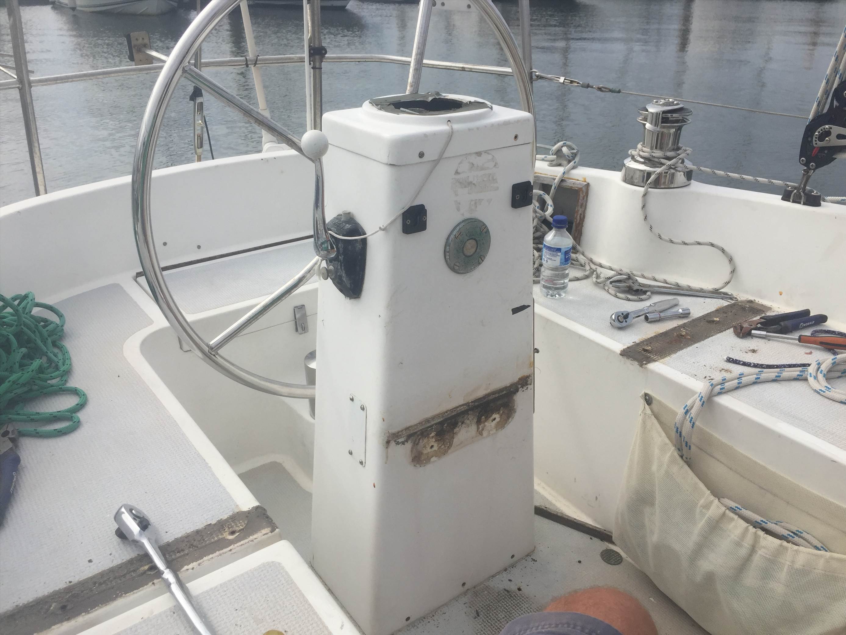 The gunwale separated from the hull due to fixings giving way due to wave action beating to windward in a stiff breeze, new auto pilot being fitted bigger hydraulic ram as the rudder requires more pressure to drive it and an antifoul.