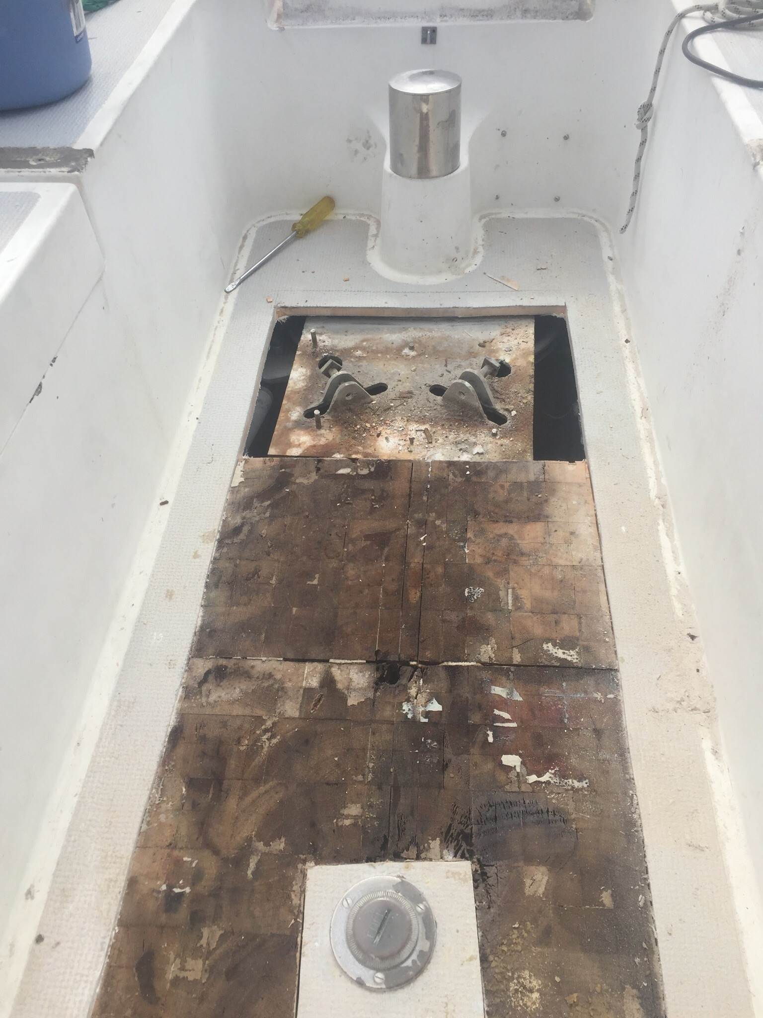 Cutting out the floor of the cockpit is an extreme measure which will need planning and skill to seal it up again and maintain watertight integrity.