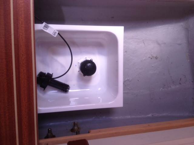 Bought a plastic sink from whitworths, bored out the drain hole and sika'ed in.