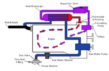 sea water through this pump and through the heat exchanger and out the exhaust engine pipe