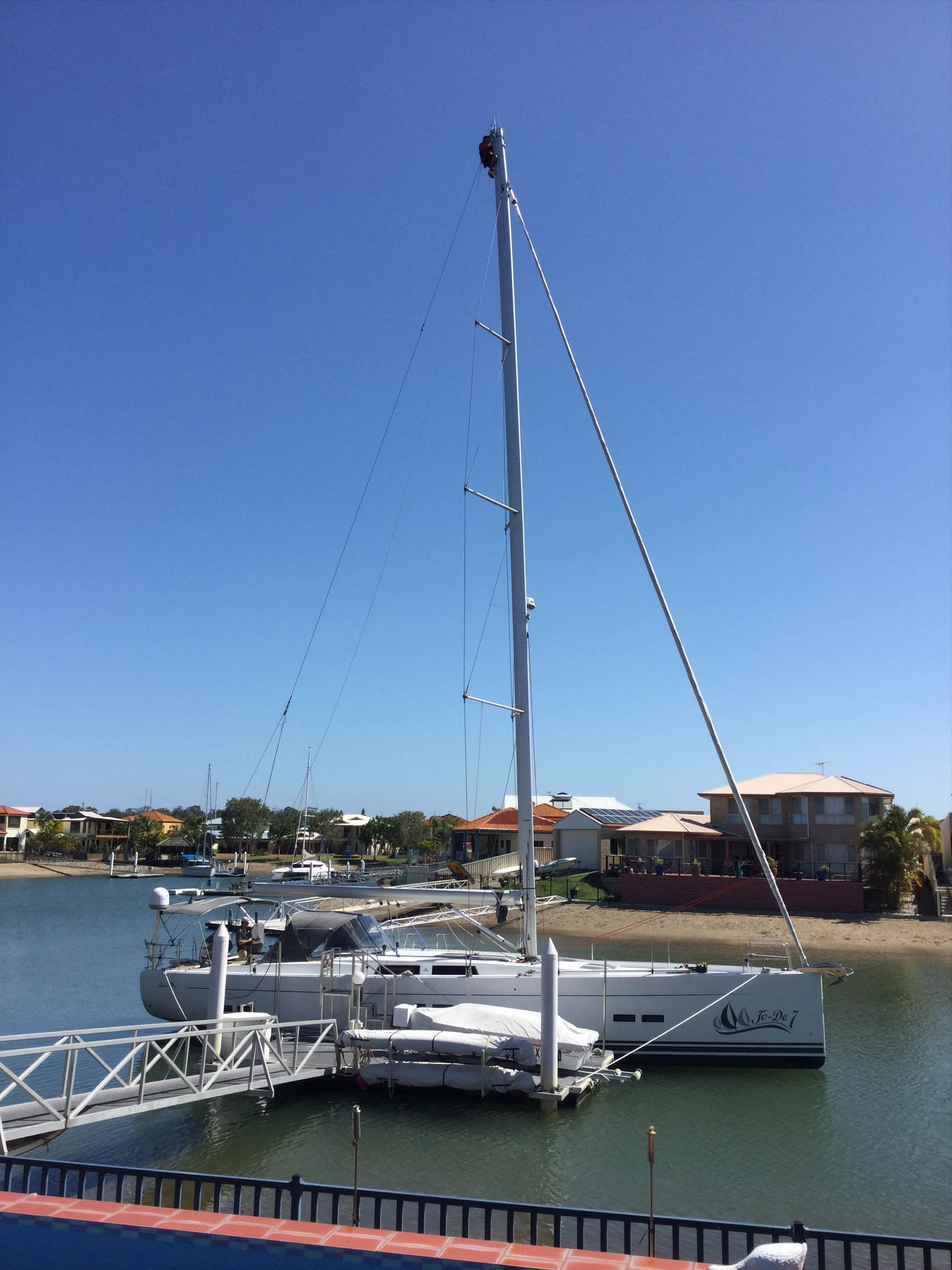 Had the riggers down today to go over the rig which I get done every 12 month. I timed it just right as I heard a bang and noticed the main halyard dropped about 20mm while sailing on Saturday, but just assumed the halyard must have slipped in the clutch. When the rigger checked the masthead he found the main halyard pulley at the top of the mast had calapsed. He also dissacembled the jib furler, released all the rigging screws,regreased all the threads and retensioned the entire rig. He is machining up a new solid block for the masthead tonight and will be back to fit it tomorrow. All should be good for another 12 months.