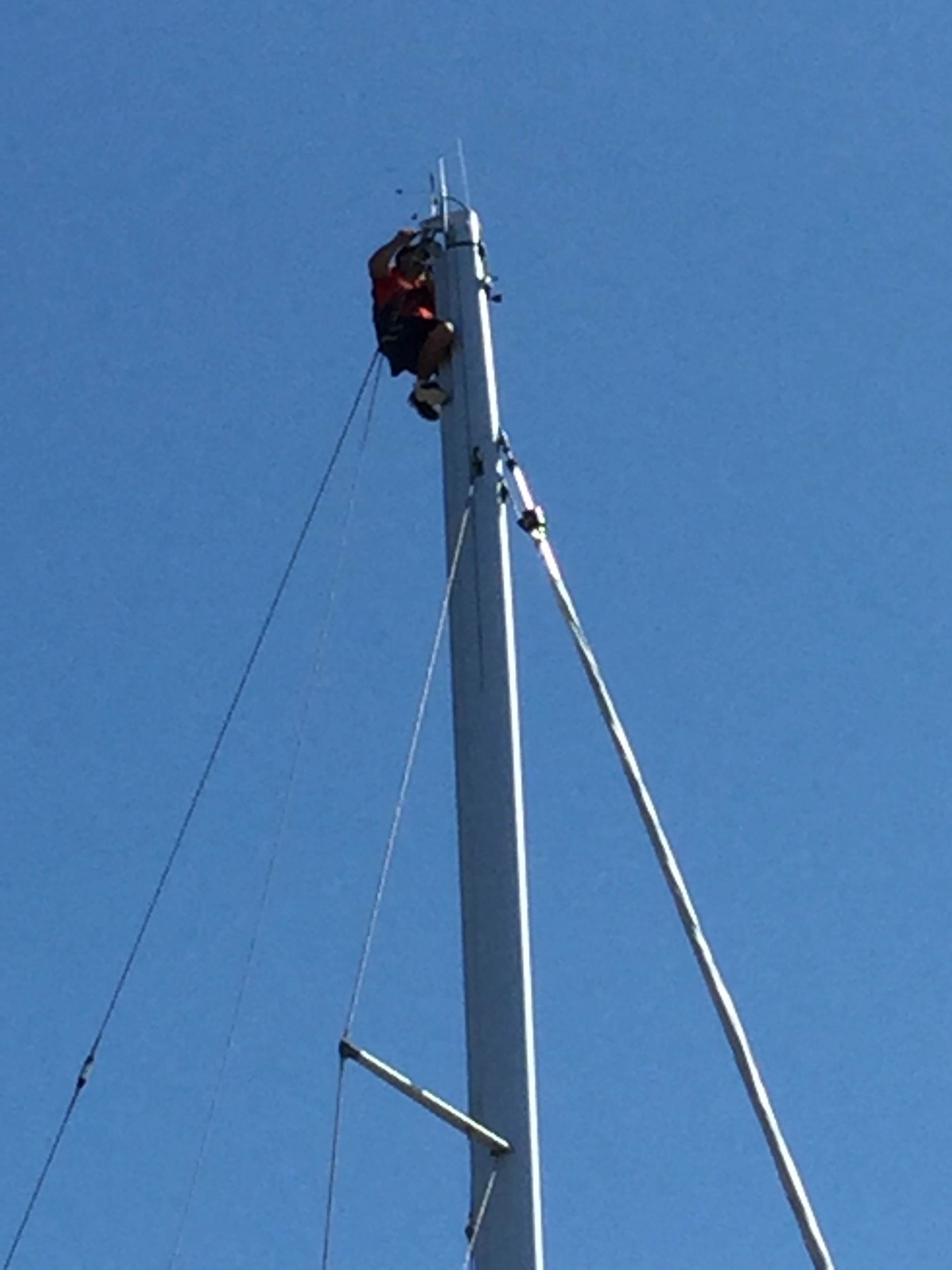 That's a long way up! What halyard did this bloke use to get up there? Looks like a bosuns chair and I presume he was winched up.