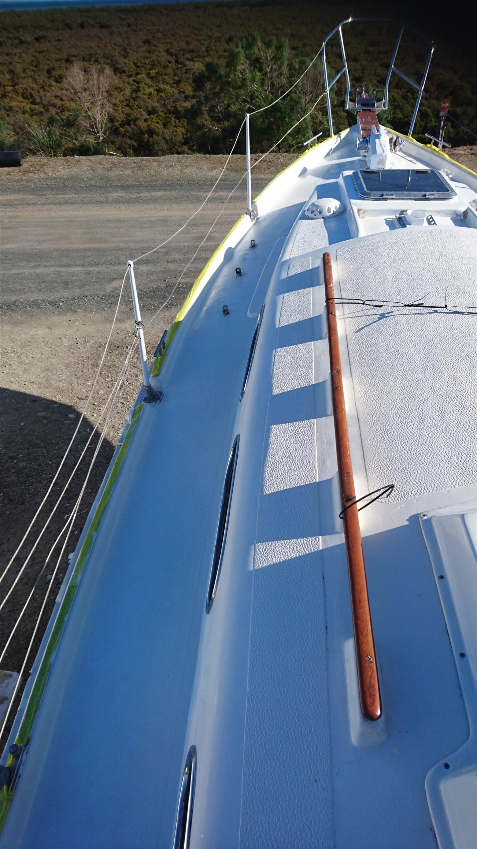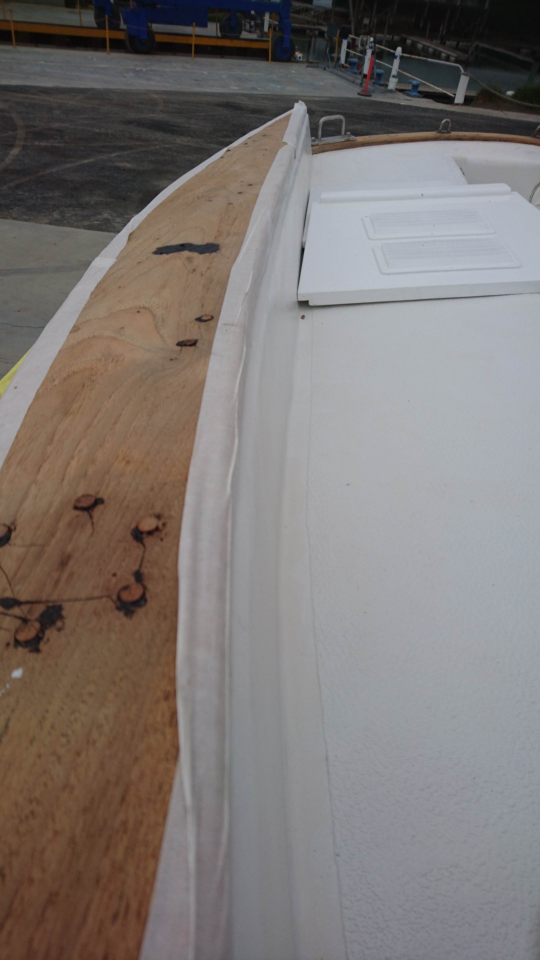 spent the last two days on my knees sanding and priming above the rub rail and deck also sanded the teak trim.