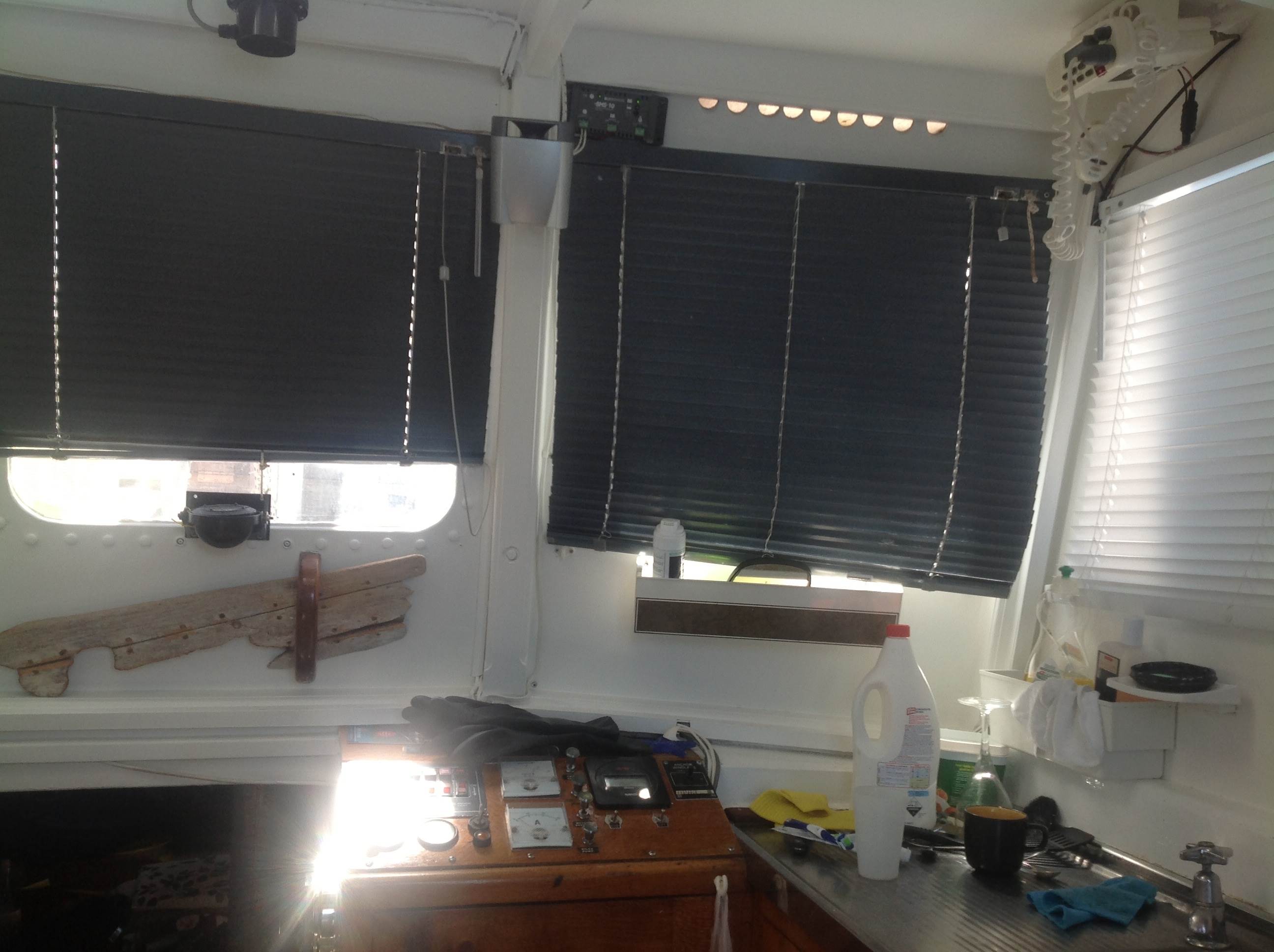 I installed two new cleats amongst what I think is the old spinnaker gear on either side of the cockpit. Now I run the Genoa sheets to there instead of the c track on the cabin roof. This will stop further cracking and stuff happening. Poor old boat !!
