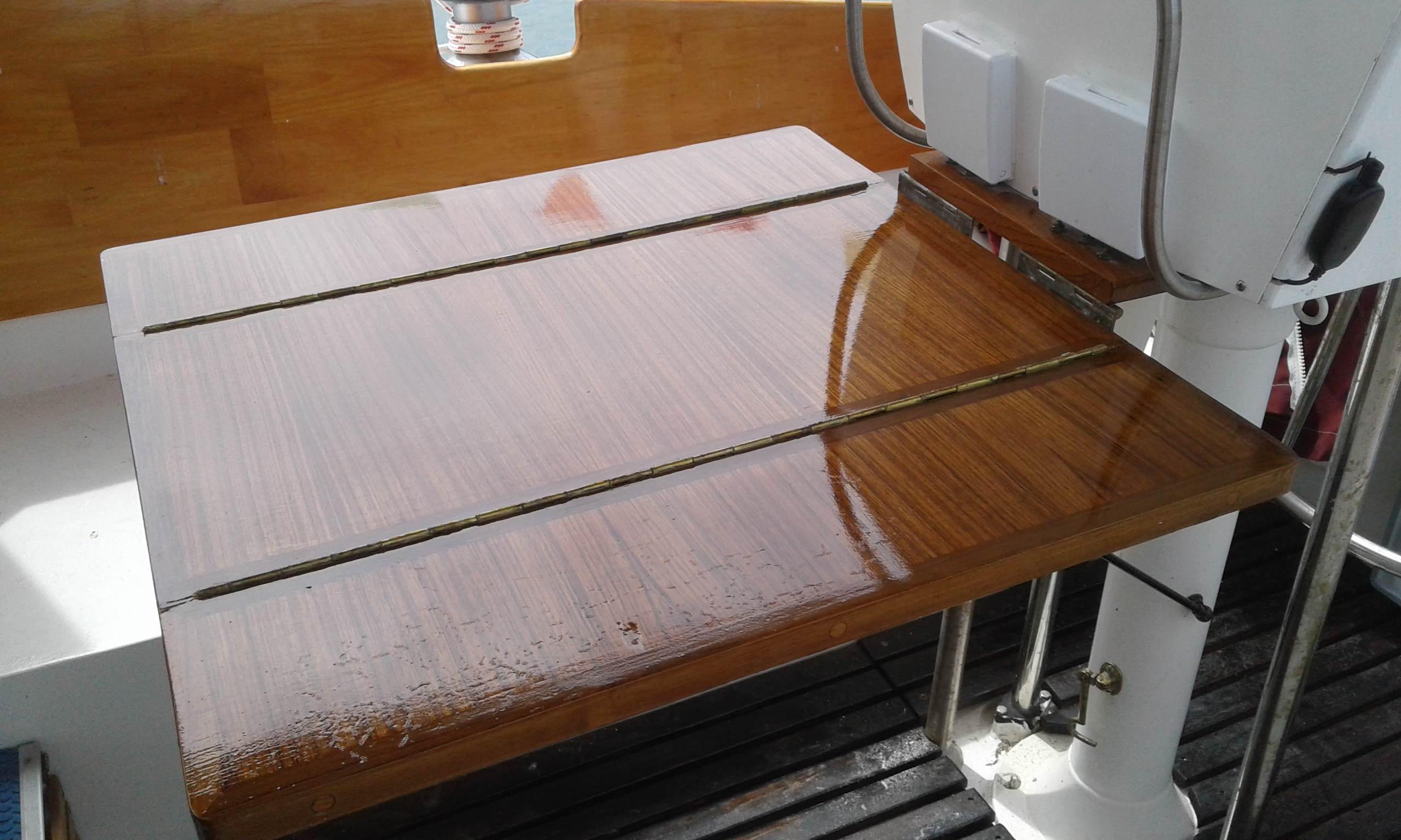 Keep things out of the sun including my autopilot controller moving the wheel back gives me every bit of area in the cockpit.( if the mizzen ever went back on its a easy afternoons job) except for strengthening the mizzen bulkhead to the cockpit floor which I'll do a project in the next couple of years while sailing anyway .(some mat and epoxy)