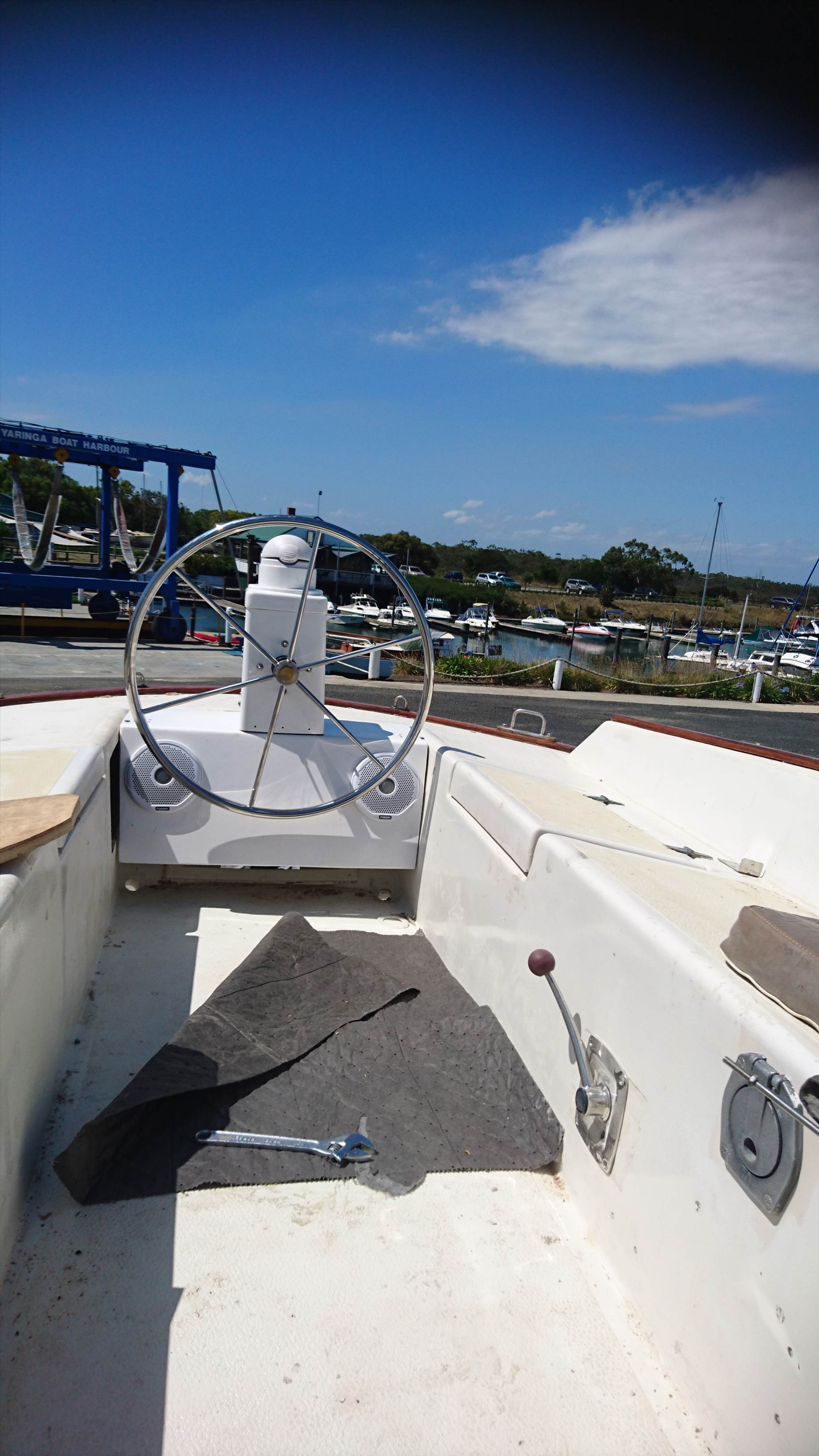 Geez HG that really is a dilemma. As it sits now you will find it difficult to see what's in the binnacle unless you are behind it, but the engine controls are about 1.5 metres in front of the wheel! if you're sitting in front you're reaching backwards(and you may need to look back at the wheel to grab it, engine controls still not ideally placed…when all the action is going to be happening at the front)…much easier to stand behind a more centralised wheel with a clear view ahead.