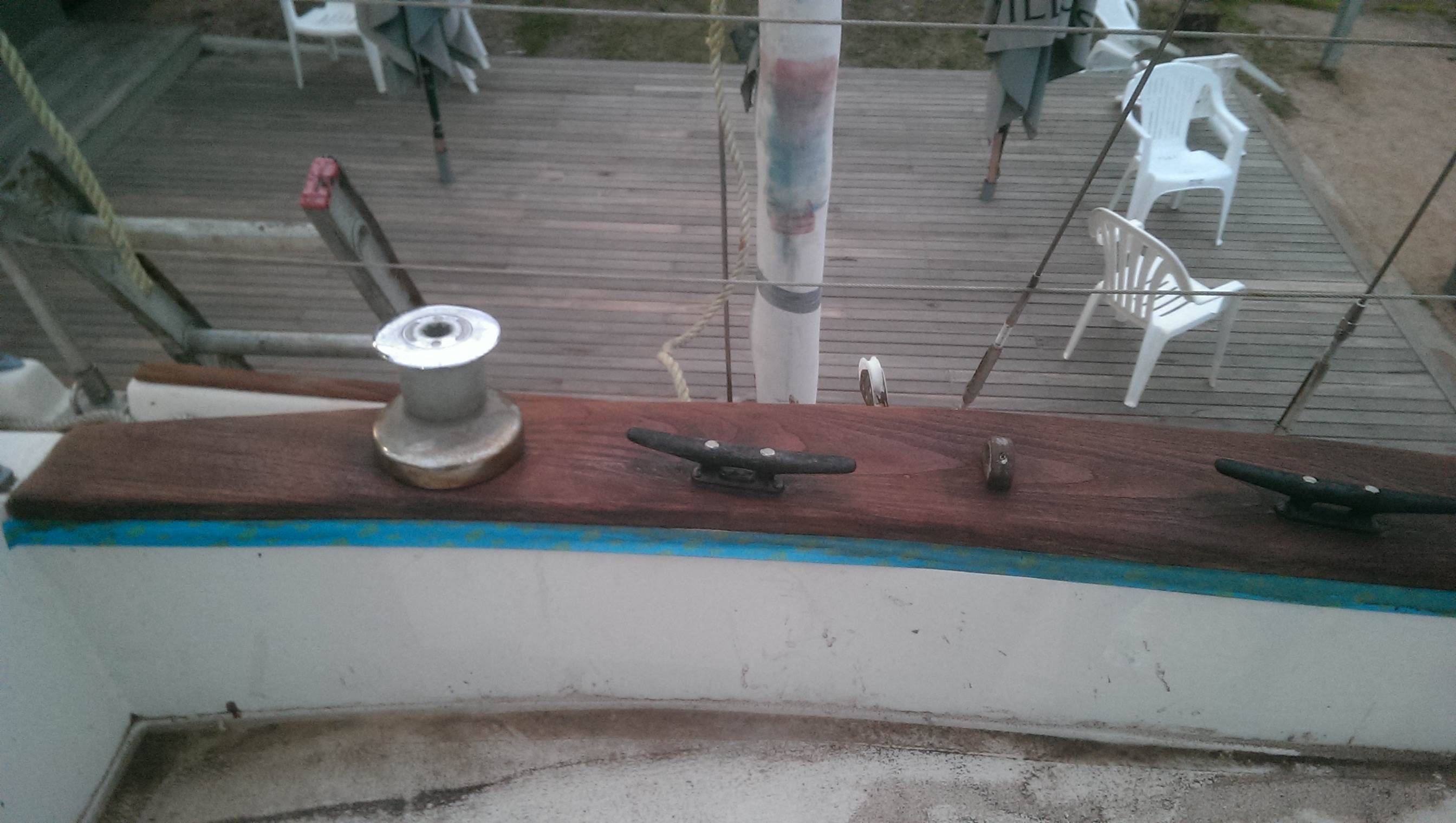 Bad photo sorry. Gave her another coat of Sikkens while tied to the pier and sponged rust remover on her stainless she is starting to look nice