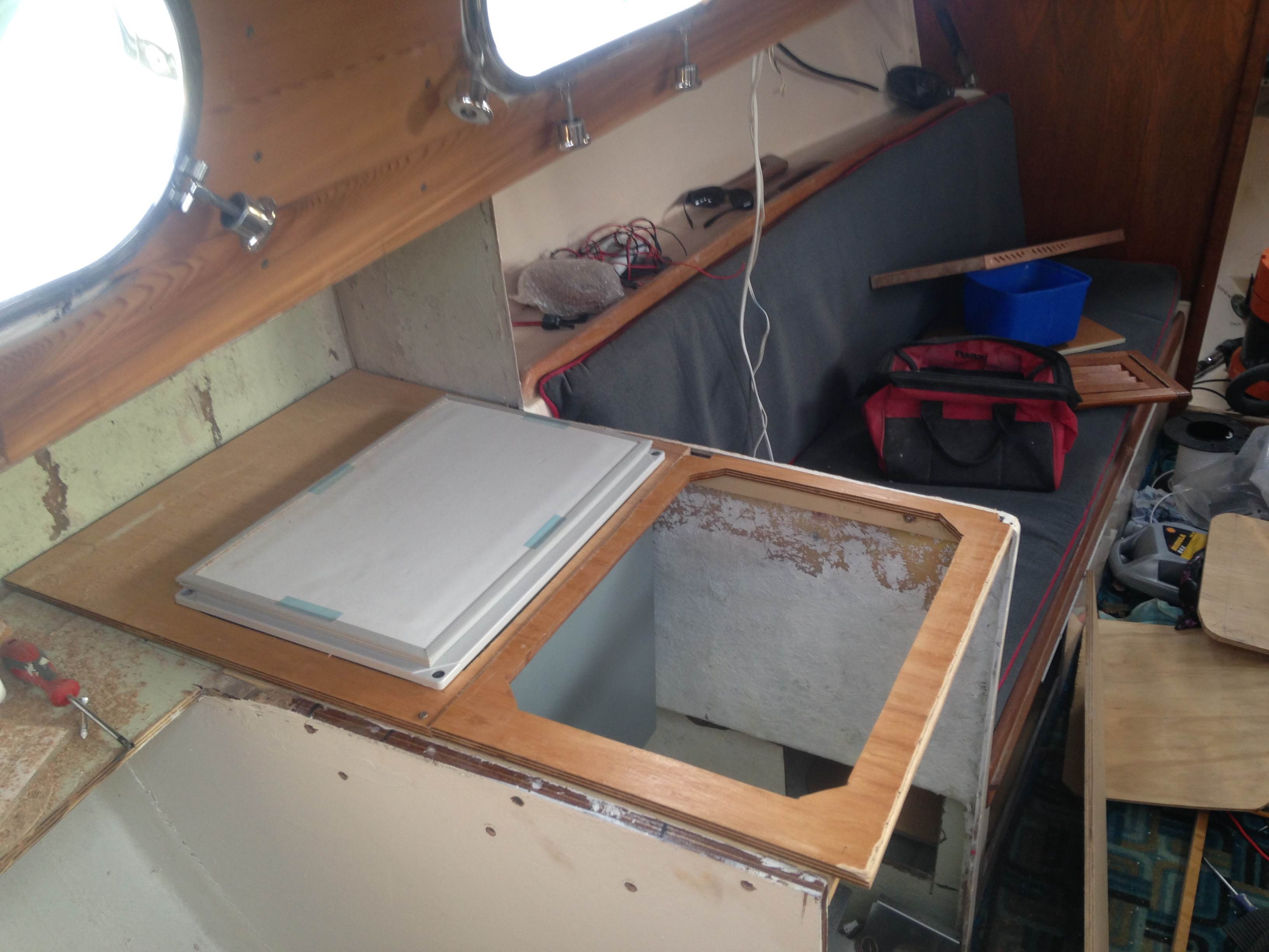 Started fitting my fridge mountings as the other fridge arrives next week. I moved the compressor as I have to make mountings for them at the weekend and get that epoxied to the hull