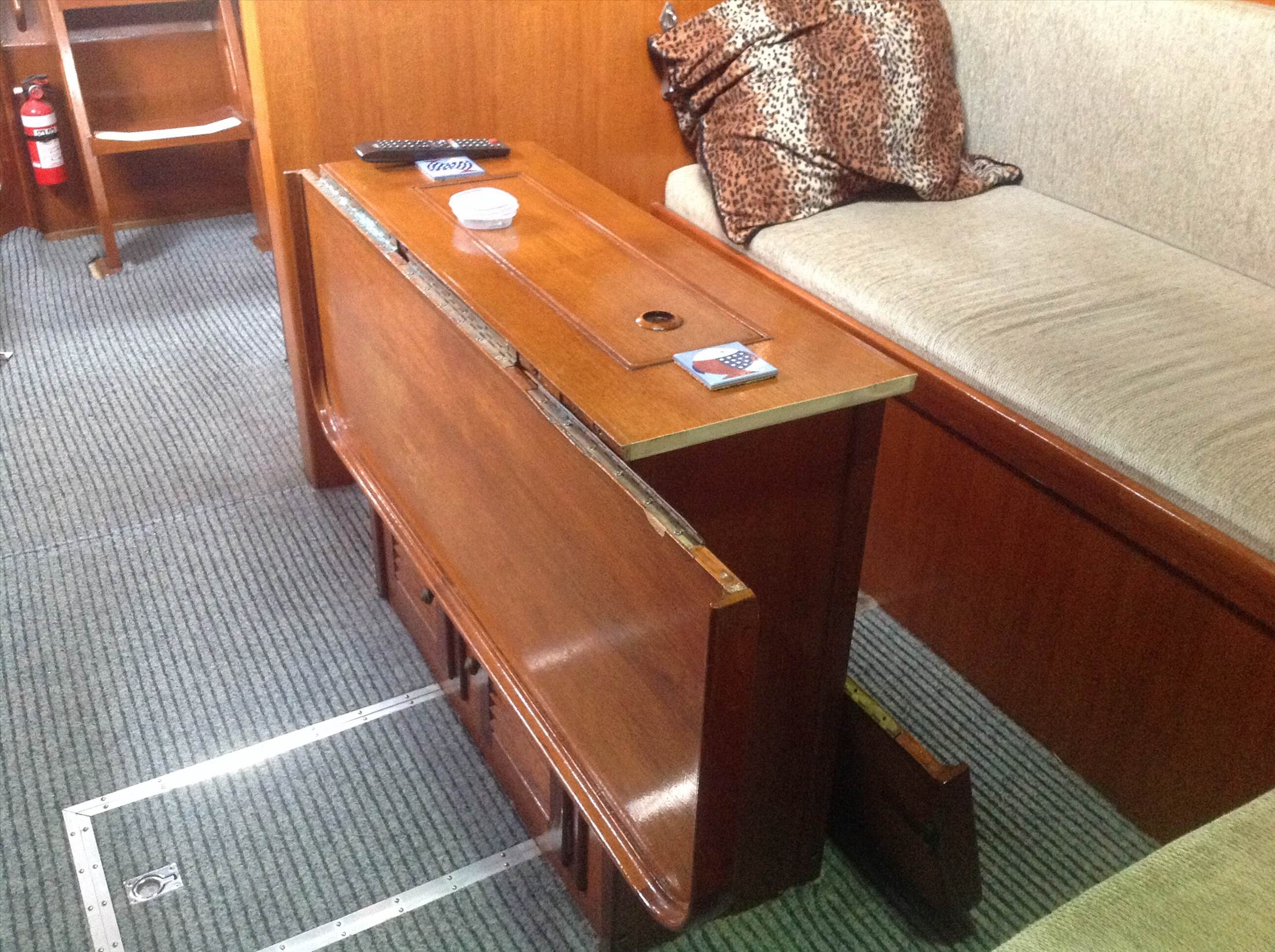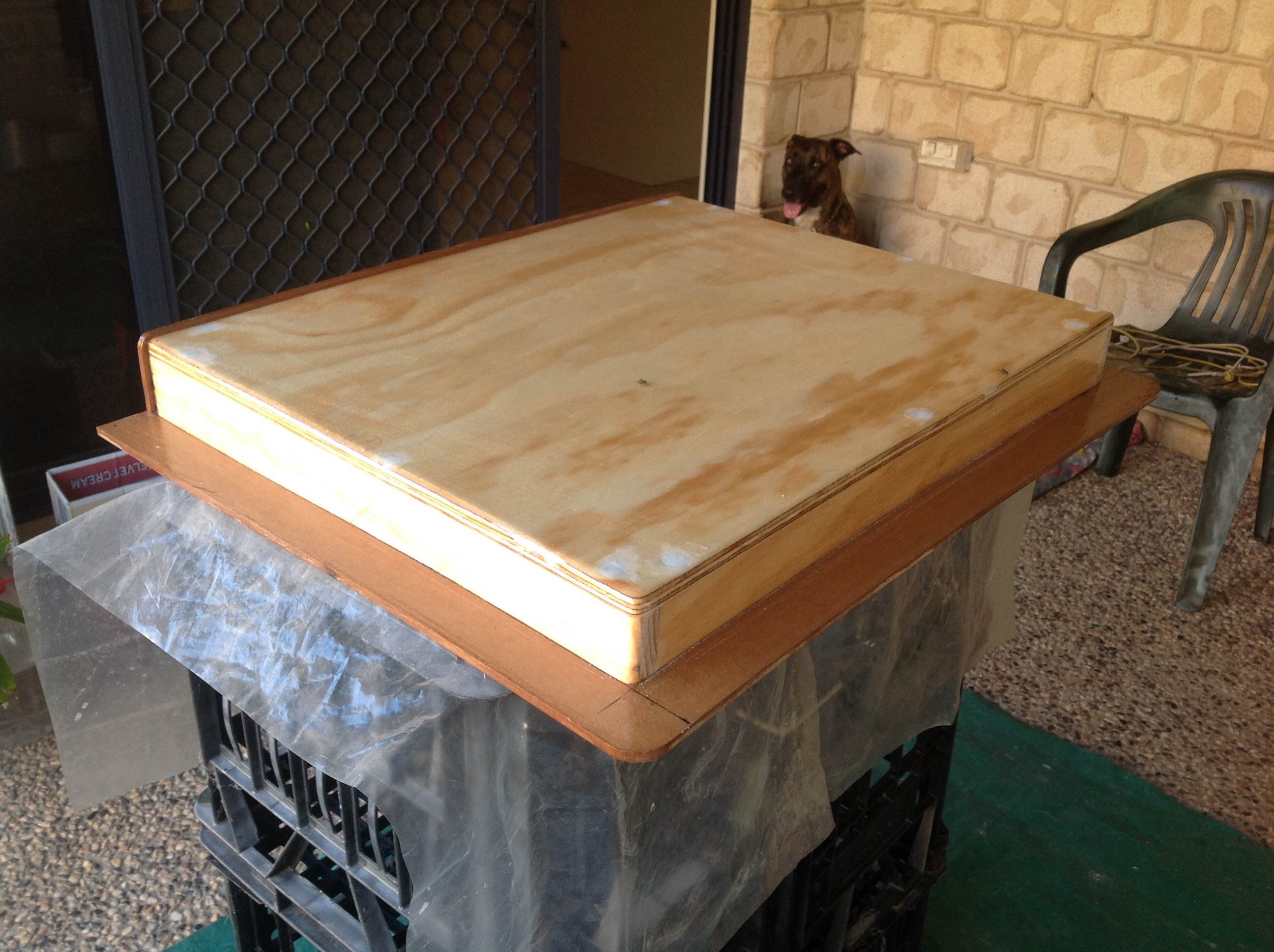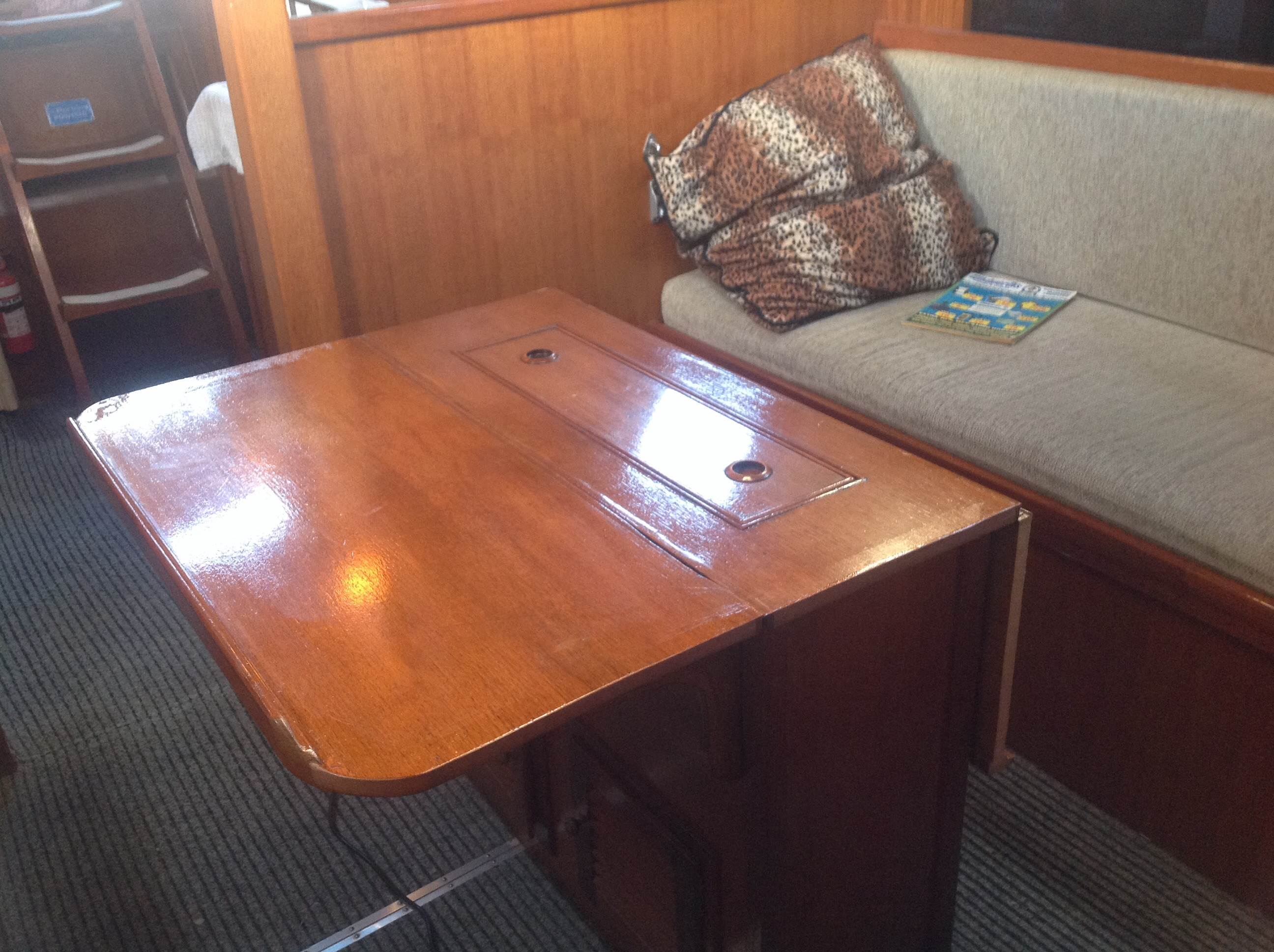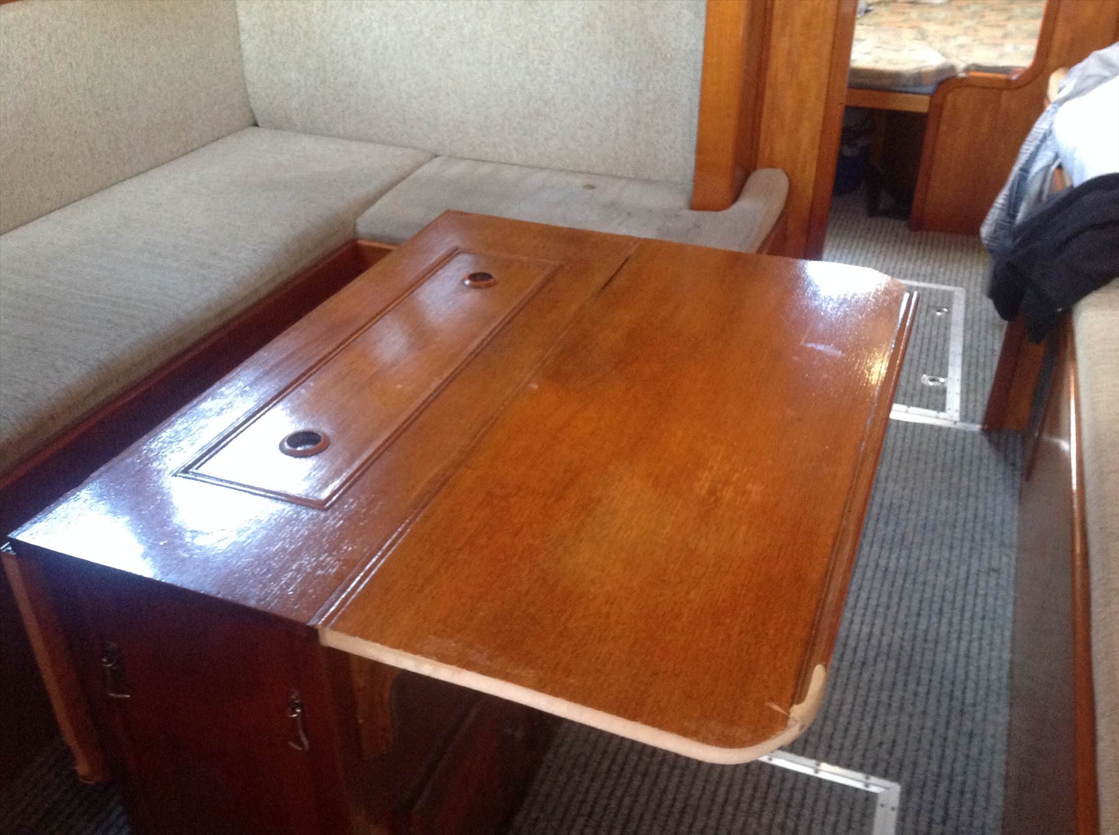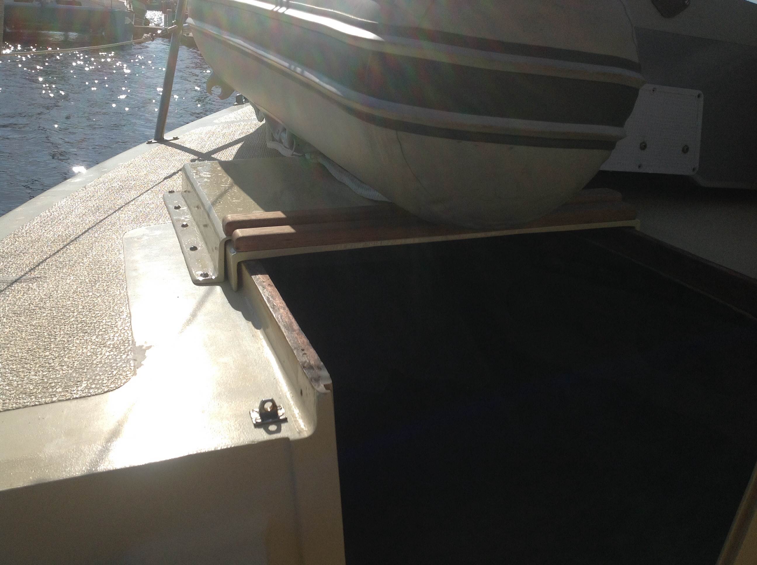 Hi, now I can have dinghy on "grany flat roof" and enter without lifting dinghy up. Before I had to lift dinghy to open hinged hatch, no more. Made sliding hatch cover as one pice molding on wooden plug and slide is old hatch.