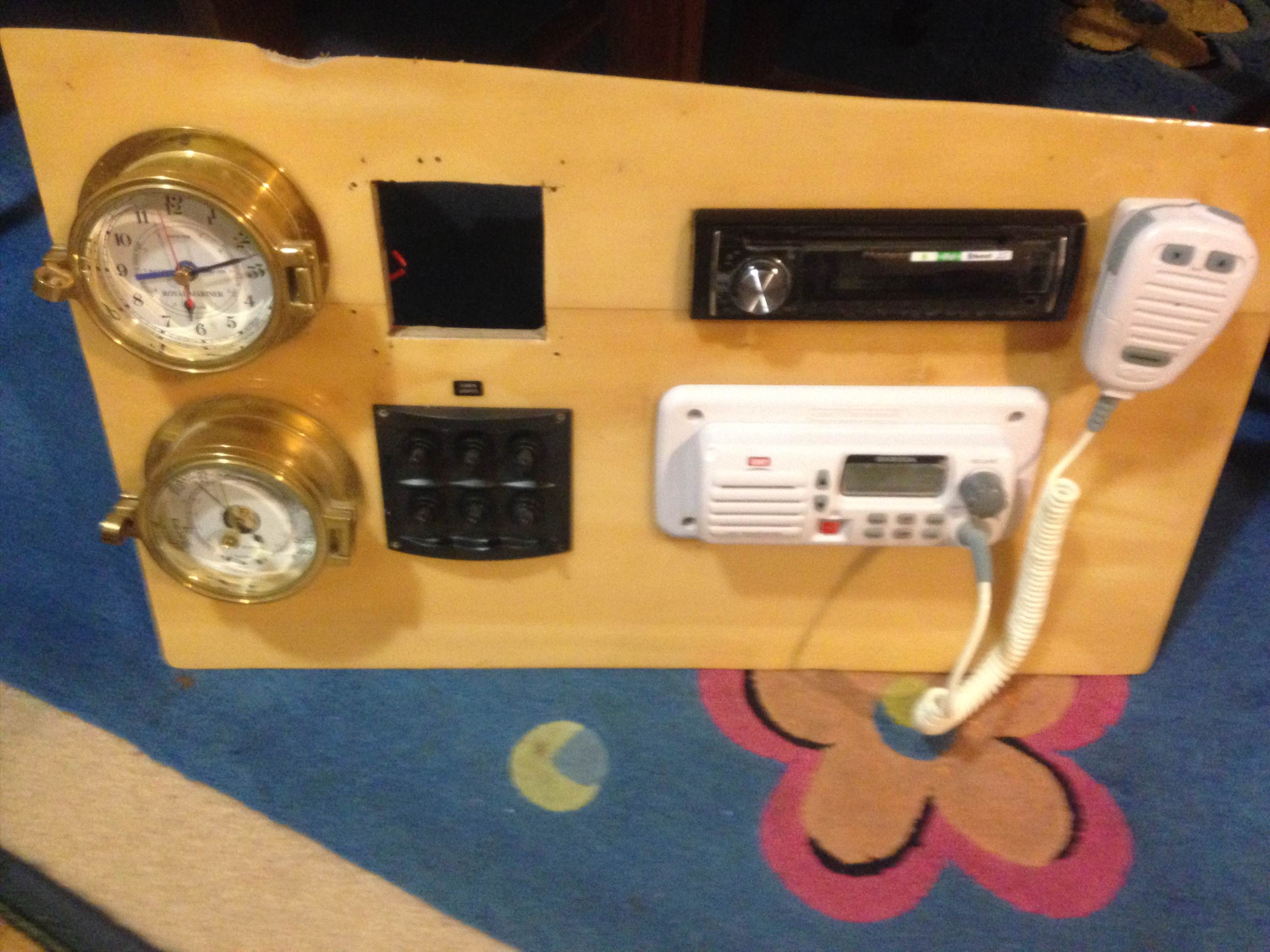 Not much time on the boat today had to cook lunch for a multitude .Cut out two spots for a couple of 6 Gang BEP switch panels for cabin lights thats about it, I have decided too splits the wiring spaghetti into two part cabin stuff and sailing stuff makes it easier to manage .Plus a quick wash down on the deck . But tomorrow Ill have a go early . My marina neighbors have gone home today so a little noise wont matter.