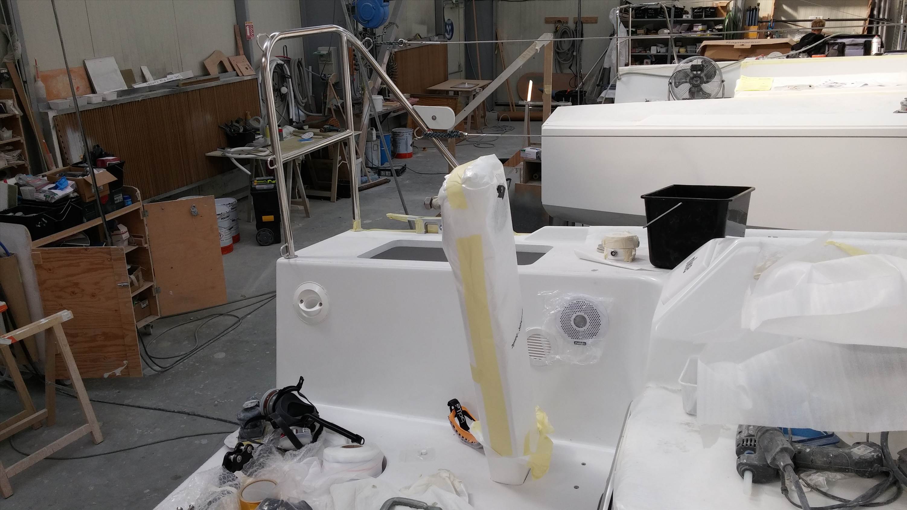 Pedestals are in! This makes it harder for singlehanding, as the cockpit is about 3mtrs long to the winches, and of course with the wheels you are locked in position a bit . With the tiller, you sit a lot further forward, so you can reach the winches, ie: better for singlehanding. I know I can use the autohelm to trim and tack, so it is not all doom and gloom, but it was one of those choices that could go either way, whether or not it is a good thing, time will tell.