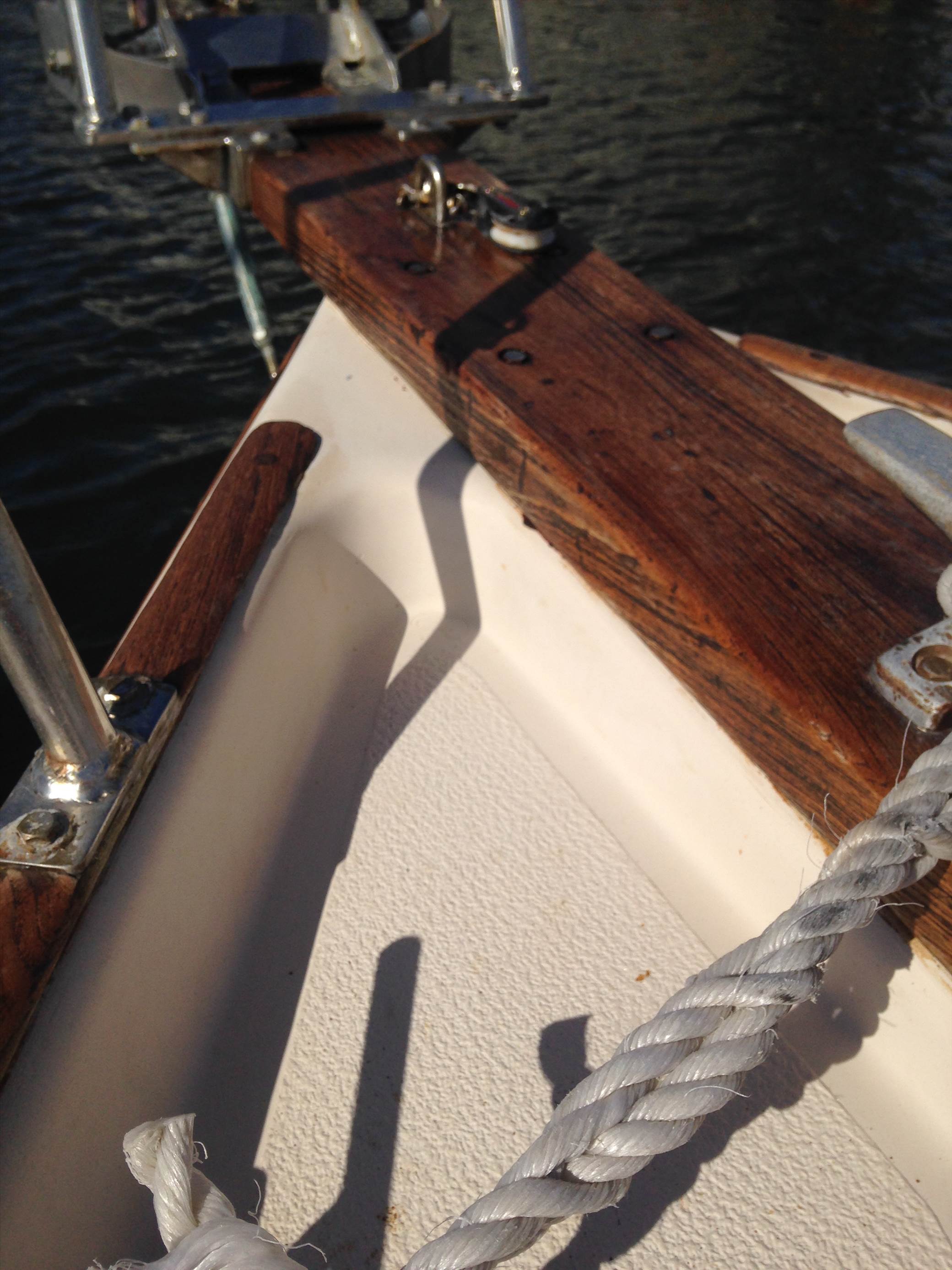 Except for the last top laminate at the rear its all gone so the winch chain has a straight pull from the bow mounted anchor roller. and takes into account the roll of the deck.