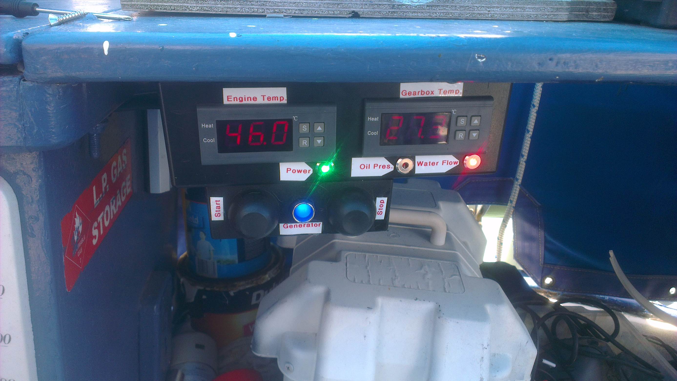 Installed Motor and Gearbox Temperature indicator with high temp alarm also installed alarms for low oil pressure and low cooling water flow.