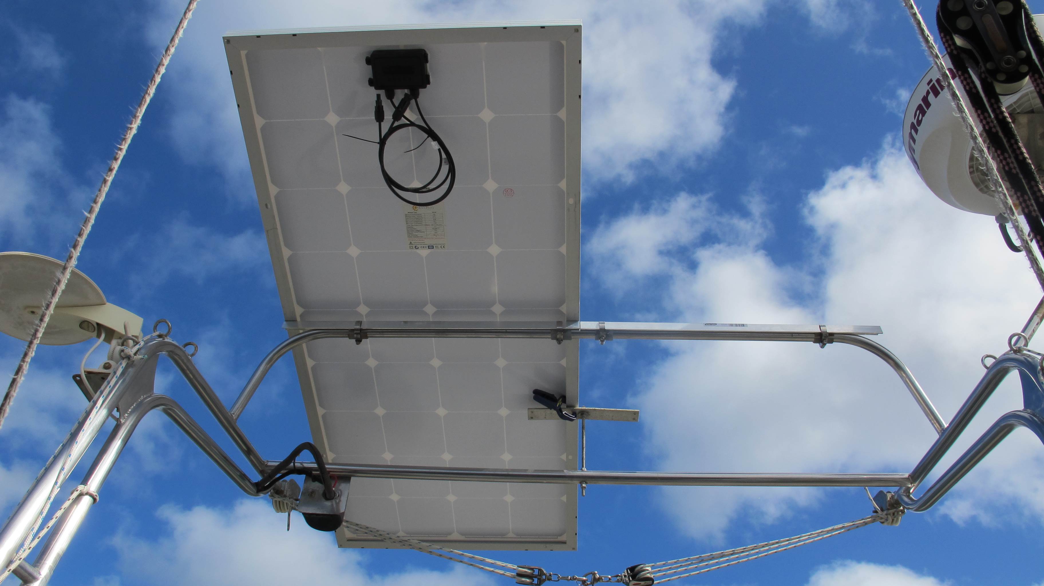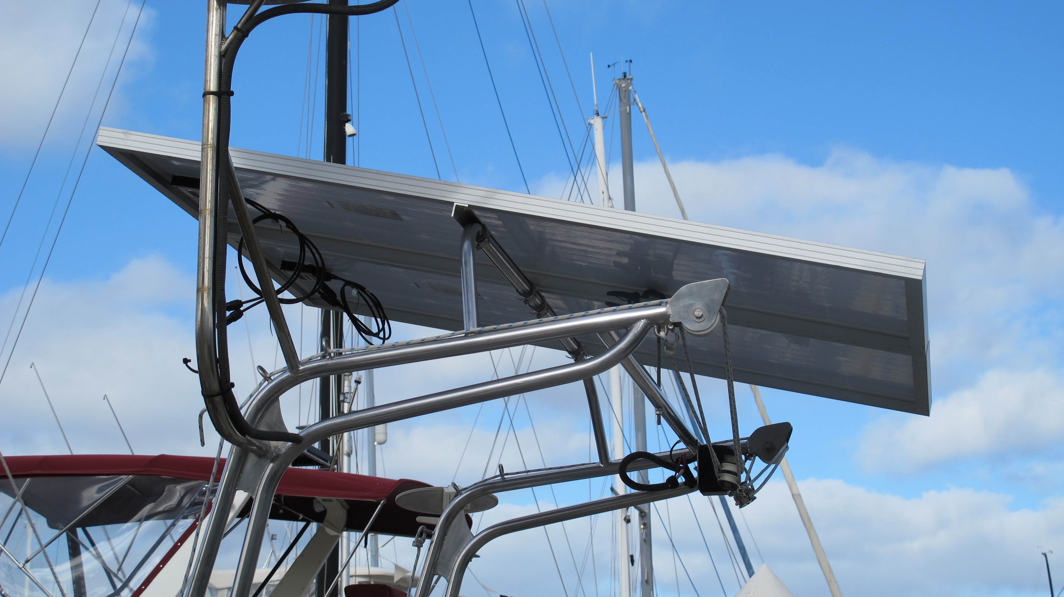 Removed the old BP solar panel and test fitted the new German/China 140 watt panels , brushed the stainless for a overnight removal and discussed with the local stainless fabrcator how to stiffen the rig.
