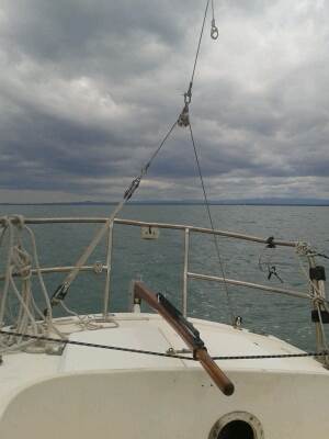 'Mark Occy' the octopus strap took care of the helm for most of the day, requiring only an occasional adjustment here and there. Aria was amazingly well balanced in the conditions of that day - 7-13 knots of breeze - reaching and close-hauled. Yes, after I took the pic, I did crack the jib off (and adjust the cars)