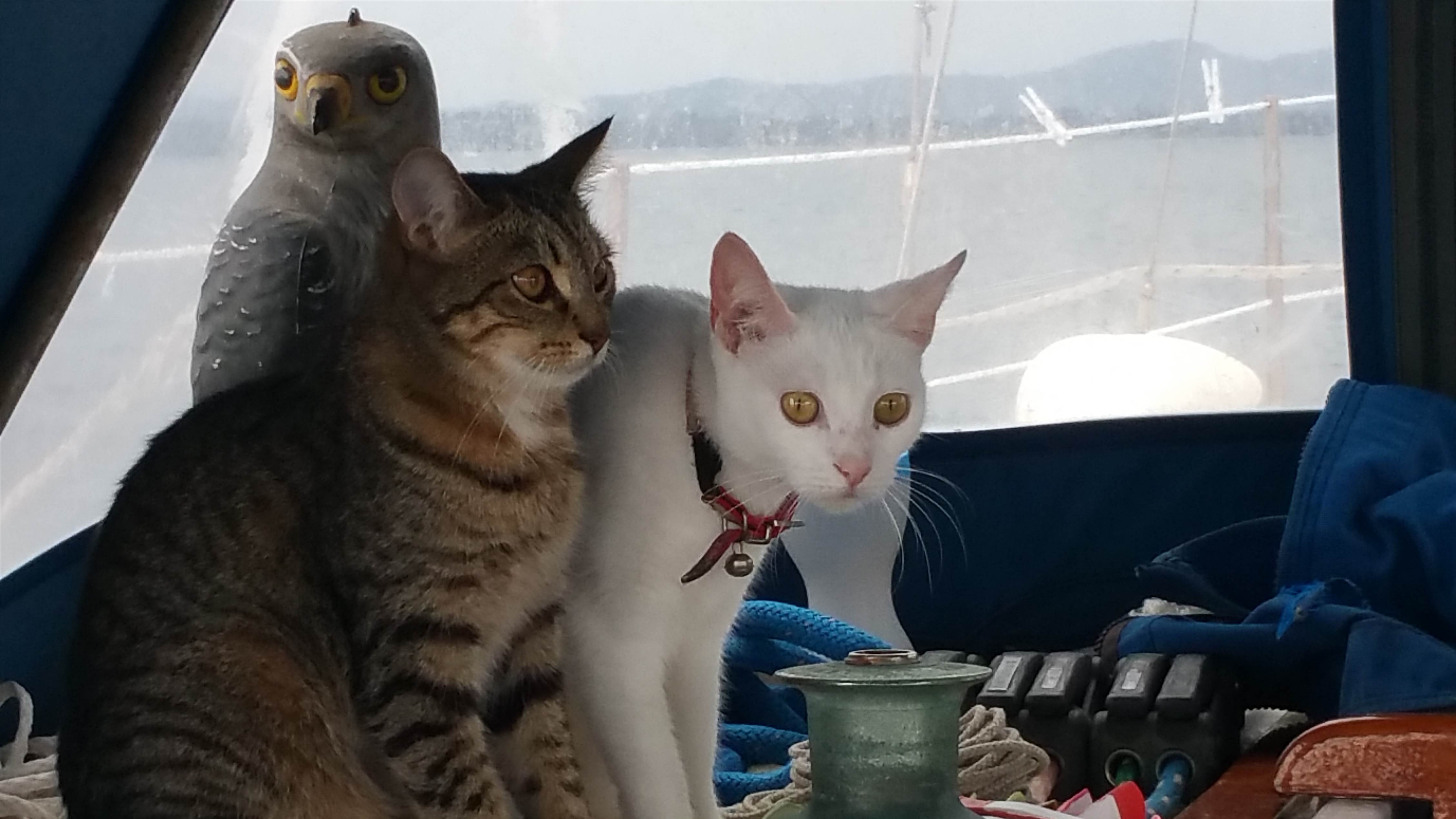 The cats went through stages. On the marina yhey were completely happy. When I anchored out in the harbour and it was roly Missy just lay on the floor looking seasick for about a day. By a couple of days all three weee scampering around regardless of the swell. When my son was pulling the anchor and I was doing laps of the harbour in the dark at 4 am Milly was scampering round the deck and up on the boom but when we went out into the swell they all found corners to hide for about 5 hours. Then they settled and slept quite happily the rest of the way.