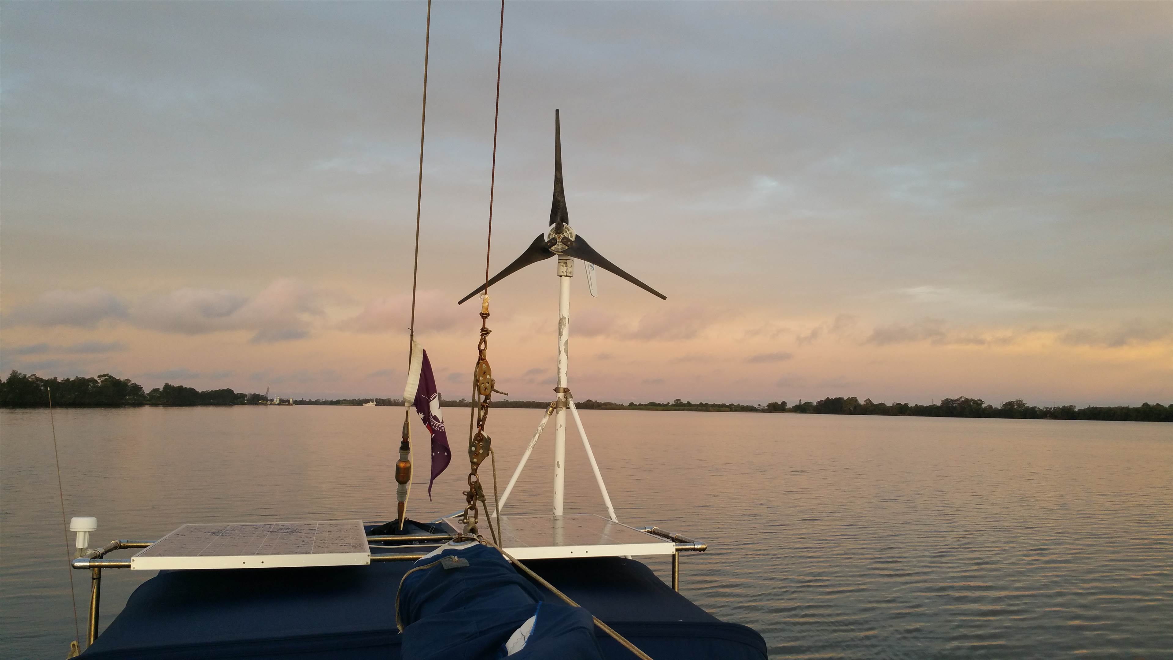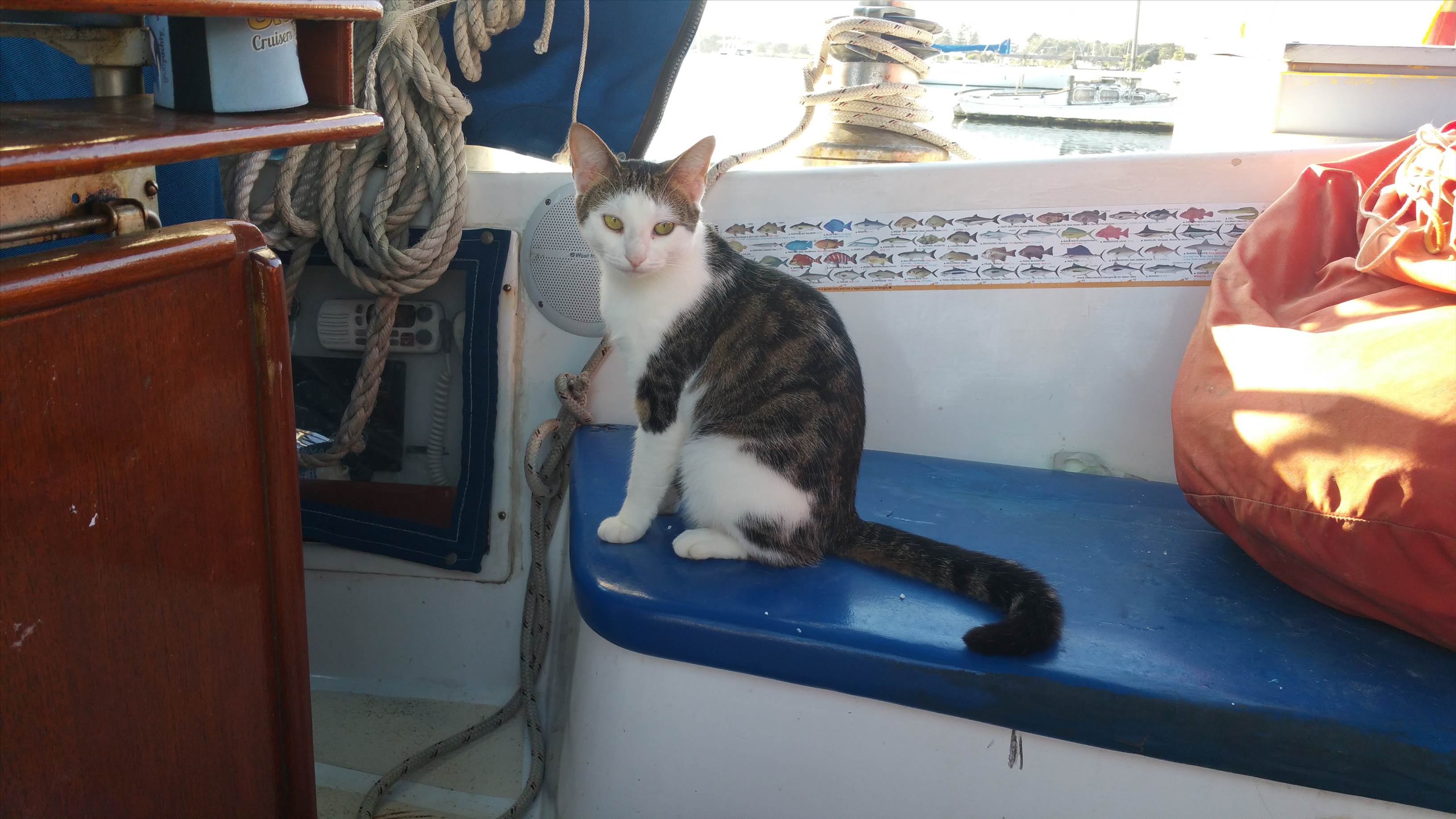 The cats went through stages. On the marina yhey were completely happy. When I anchored out in the harbour and it was roly Missy just lay on the floor looking seasick for about a day. By a couple of days all three weee scampering around regardless of the swell. When my son was pulling the anchor and I was doing laps of the harbour in the dark at 4 am Milly was scampering round the deck and up on the boom but when we went out into the swell they all found corners to hide for about 5 hours. Then they settled and slept quite happily the rest of the way.![]()