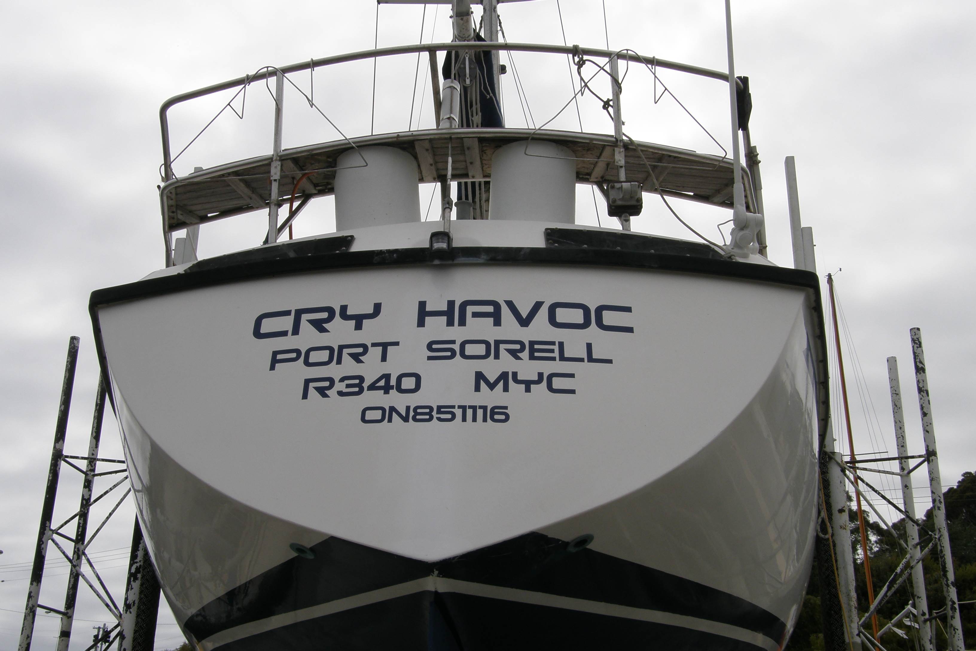 cry havoc started life as build number 20 originally called gail force for a couple of years and was then bought by legendary yachtsman colin betts who renamed her cry havoc for his uncle who served on the HMAS Kanimbla whose war cry was from shakespeare "cry havoc and unleash the dogs of war".