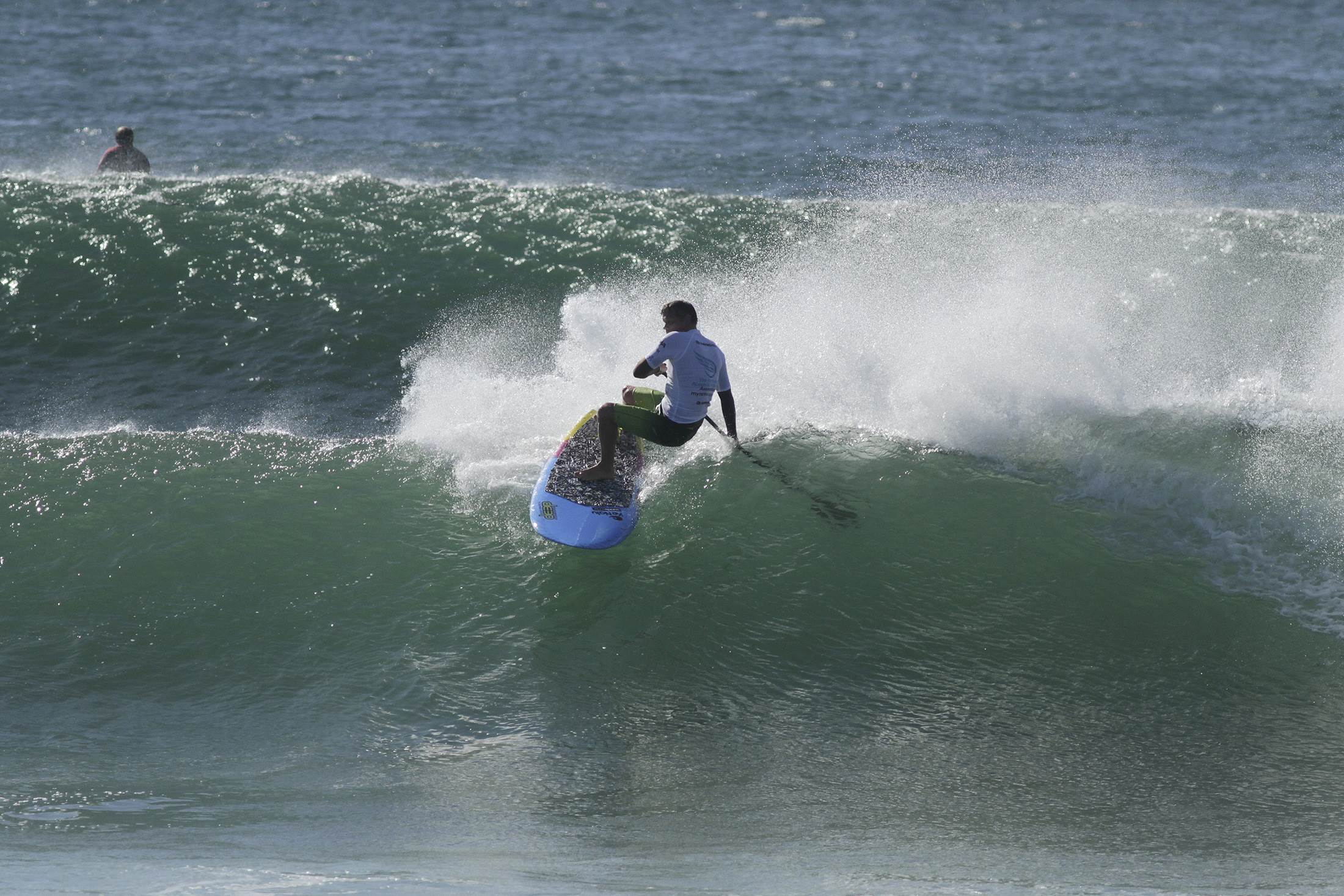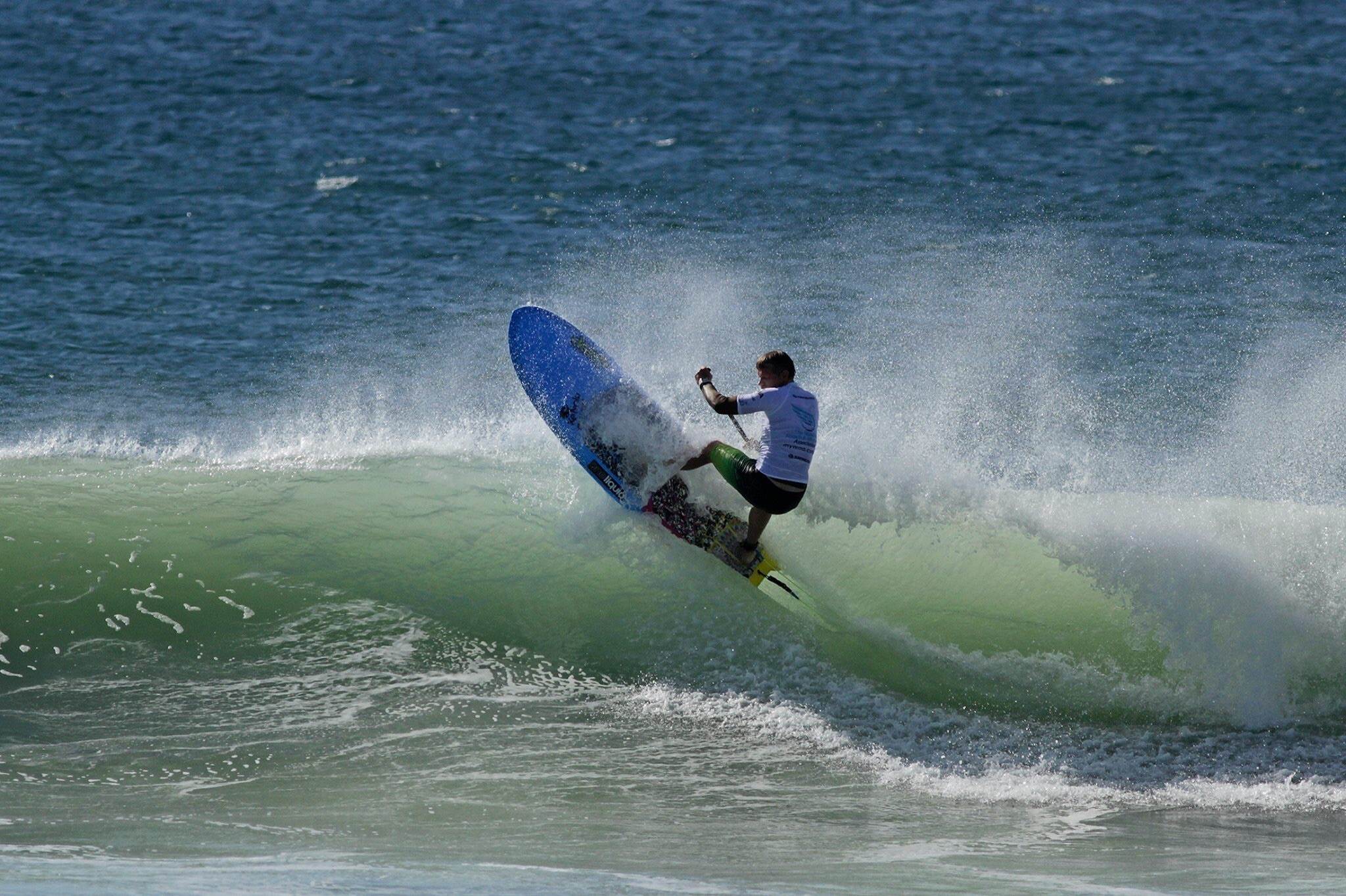 The sets at Wanda were a little inconsistent that day and I waited a good ten minutes for another wave. I could see some lines forming way out the back and the thought of getting caught inside one of those closeout, clean up sets I'd seen earlier, had me paddling towards the horizon. The first wave of that set was slightly smaller than the second one but it looked a better shape. I began the take-off arc to change direction and head for the right hander. I had complete confidence in the little PaddlePop's ability to stay in control and get me straightened up and just in front of the feathering lip in time. A fall or even a little wobble at this stage would have definitely had me missing the best wave I'd seen all heat, maybe even all morning. I got it and it was a good one, a really good one. Using my first wave as a practice, I took the same line down the face - with a slight fade left before getting down as low as I could to drive into a big, deep, smooth bottom turn. Remembering my learnings on good heat strategy and wanting to build on my scores throughout the heat, I knew I should be pushing my turns harder on this wave. This wave was bigger and steeper than my first one so the elements were conducive to going big. The bottom turn lasted forever as I froze in that low crouch while the 7'4" drove around a full 180 degrees and started heading up the face again. The long, straight rail of the modern planning hull held its line beautifully as the blade of my KeNalu Konihi skimmed the face of the wave; tap, tap, tapping over the ripples. By this time the wave was starting to pitch right above my head and I made the concerted effort to smack the crap out of it. A BIG first move always impresses the judges. The PaddlePop felt great under my feet and gave me the confidence to pivot tightly as the wide nose connected with the lip and spin it around so I was pointing back down the face again. Keeping pressure on my front foot and my weight forward had me hurtling towards my next bottom turn. This one was a bit quicker and less drawn out though as I could see the wall starting to race away and I had to get moving. The little 7'4" was flung out of this bottom turn with incredible speed and I was heading for the lip again in no time flat. I approached the top of the wave less vertically than the last top turn so I stabbed the top of the wave deeply with my paddle and used that as my anchor point while pushing as hard as I could with my back foot to kick the tail through the crumbling crest of the wave. The small Darc Drive stabilizer in the rear got blasted out of the back of the wave and lost what little bit of traction it provides. The tail of the PaddlePop slid what seemed like two feet sideways but was probably only a couple of inches in reality. Woah. Hang on to it Casso - this is only the second turn and there is lots more epic wall to work with in this wave's future. I focussed on keeping my weight over the board and waited for the fins to bite again. Great, I soon had control and was beginning to plan my next attack on this innocent lump of ocean. The wall hadn't changed appearance much so I thought I'd do a carbon copy of that last whack. A similar bottom turn and face climb ensued. This time I was more prepared for the potential fin release at the lip so I pushed it a bit harder, this time waiting in anticipation for that cool but disconcerting drifting feeling. Wow, I made this one too and with a little more elegance I think. That's three great turns on this awesome wave and I might be able to get one more in. I redirected before I got back down to the bottom of the wave and started shooting along a high line. I quickly swapped my Konihi to my heel side as the wave started to fill up slightly. I felt the kicker on my tail pad against my back foot, crouched down very low and applied pressure to both heels evenly as I twisted my torso and lent on the paddle behind me. Holding that position, I engaged the rail and glided around a super smooth arc until the foam ball in the pocket came into vision. This was my new target. I was going to belt that thing as if I was doing a massive backside re-entry. Judges also like a good closing manoeuvre as this will be the freshest in their mind as they decide on a score. I straightened up, transitioned the board off the rail and swapped my paddle back to my toe side again. As I approached the white water, I applied pressure to my back foot, twisted my torso towards the sand and put my head down. I felt the board lift up onto the wall of foam and when I envisaged it was nearing the top, spun it around with both my feet which were vertically in line with my head and used my paddle as a brace out in front of me. The Cat's Ears tail of the PaddlePop was flicked around through the aerated ocean and the board started to fill back in under my feet. I was jettisoned out of the white water with force and was presented with calm green water again. Yes. That'll do. I'll quit while I'm ahead and soul arc off the back of the fading wave instead of trying to grovel to the shorebreak. 8, 8.5 and 8 from the three judges, averaging out to an 8.17. I think that's the highest single wave I've got in a comp. Stoked. Thank you Mr 7'4" - couldn't have done it without you.