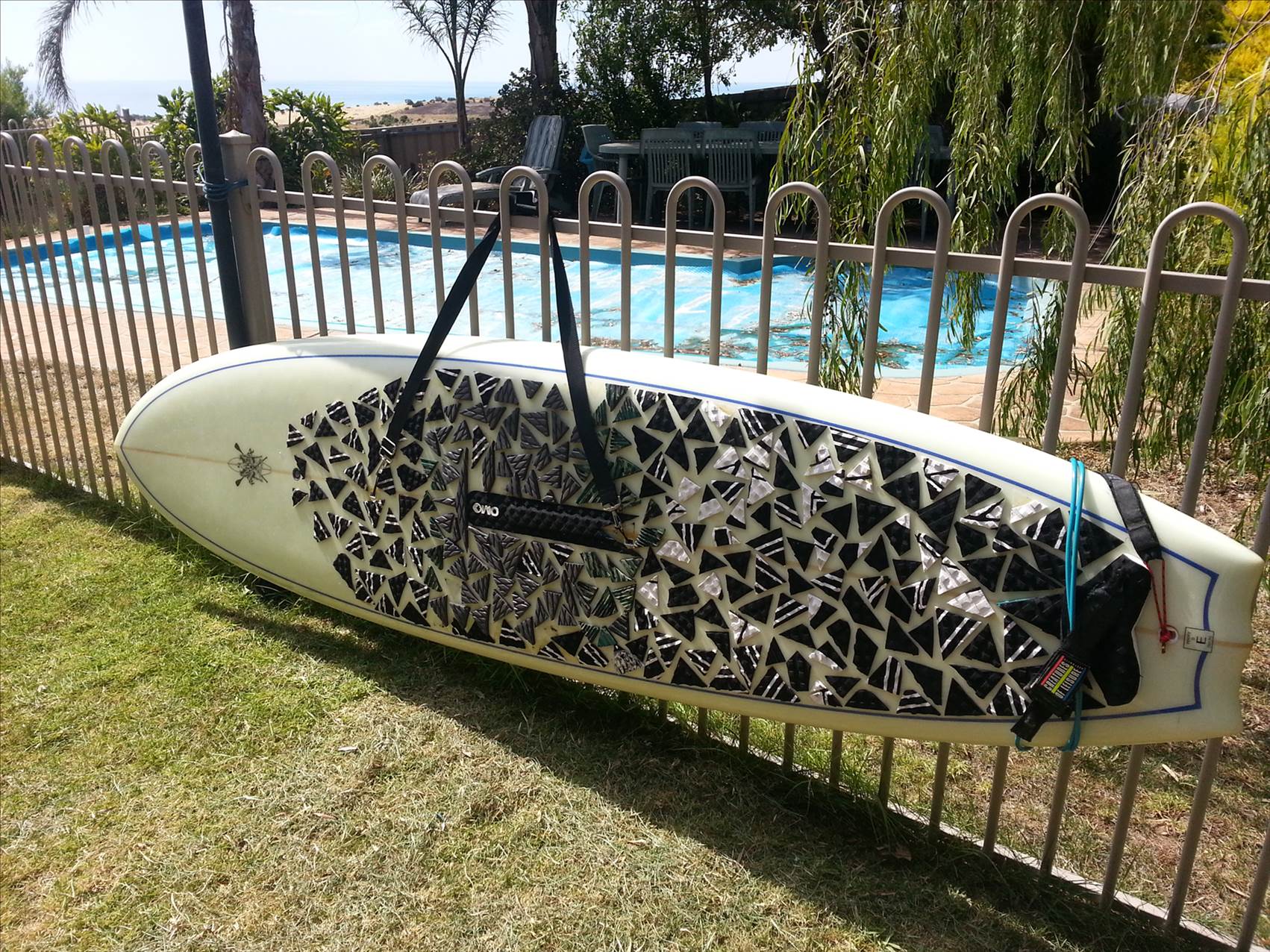On another thread, someone had suggested a long strap secured at two points on the board and slung from your shoulder. I bought two leg rope plugs from my local surf shop for $5 each, drilled two 25mm holes in the board and epoxied in. With the heat here at the moment, the resin cured in about 10 minutes! I had a old padded board bag shoulder strap lying around, conveniently with clips on each end, so was able to try it straight away. All I can say is that it works perfectly, is really comfortable, and will just leave on the beach with a towel, while out in the water. Hopefully the pics show how I did it.![]()