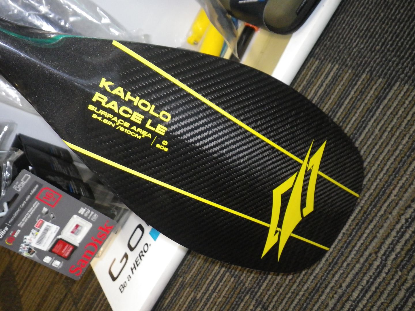 The quality of the paddle is a step up even on the otherwise great looking Kaholo of 2013, it's full pre-pregged carbon so the weight is even lower. My Kaholo 2013 cut, was about 485grammes - the new Race LE came in at 419grammes (courtesy of our next door supermarket digital vegetable scale). The way the shaft is integrated into the blade is super sleek and the new handle is super comfortable.