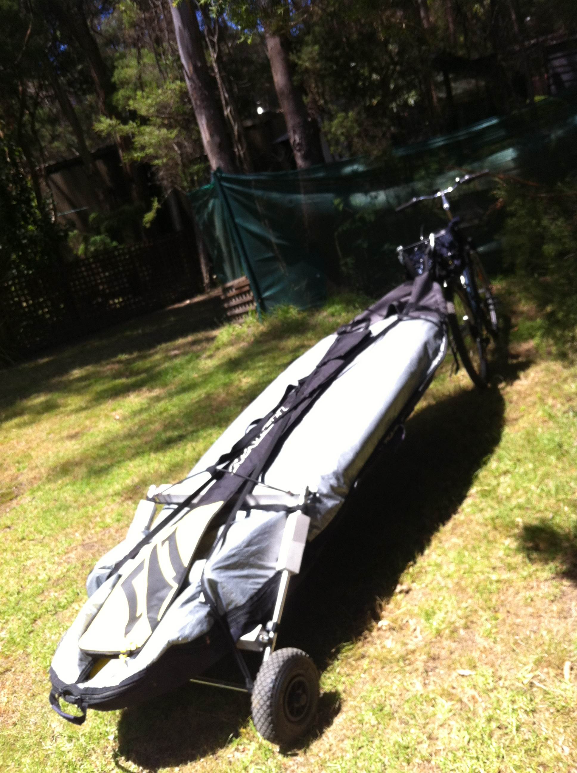 I've got a converted kid trailer that hooks up to the treadly, can send a pic if you want. It also means your boards arent vertical and prone to the wind getting hold of them. Also have a Mule that you can take on a plane and goes great on sand too. Walked a 10'5" from sunshine beach into Alexandra bay with it one day......and no, it weren't the donkey variety. Search for mule on google - cant copy the link on an ipad.