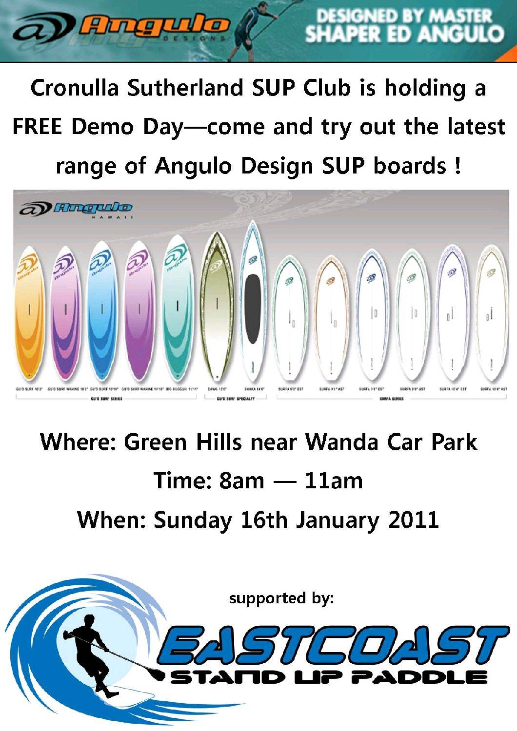 Come down and check out the Eastcoast SUP and Angulo Designs Demo day this sunday at Cronulla. This will be the Launch of the Cronulla SUP club so come along and meet all the keen SUPers in the area, join up with what is looking to be a great club, have a chat with the boys from Eastcoast and try some great boards from Angulo Designs.