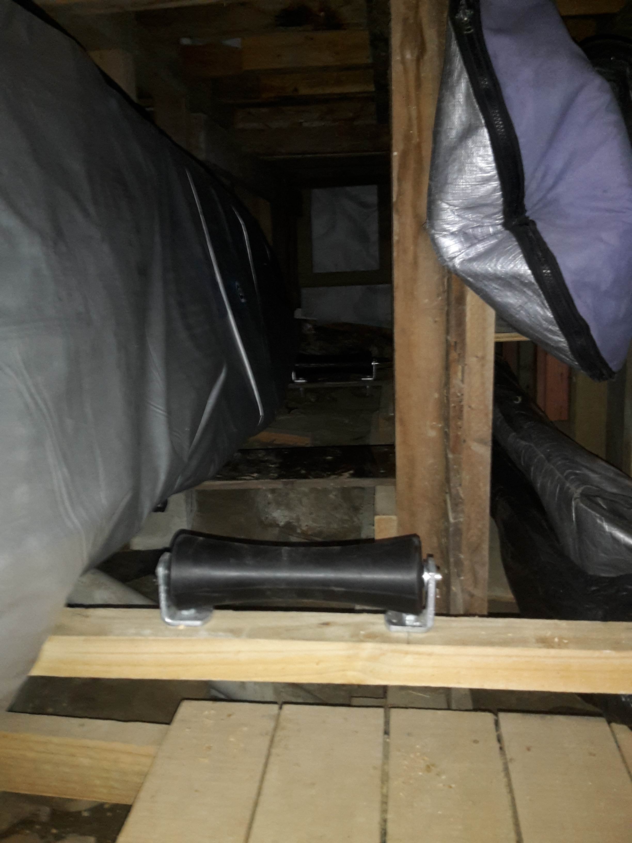 Here's my version. Under-house storage will ruin your board cover over time. Boat rollers! Works better than expected. Lots of control over rolling the board in and out.