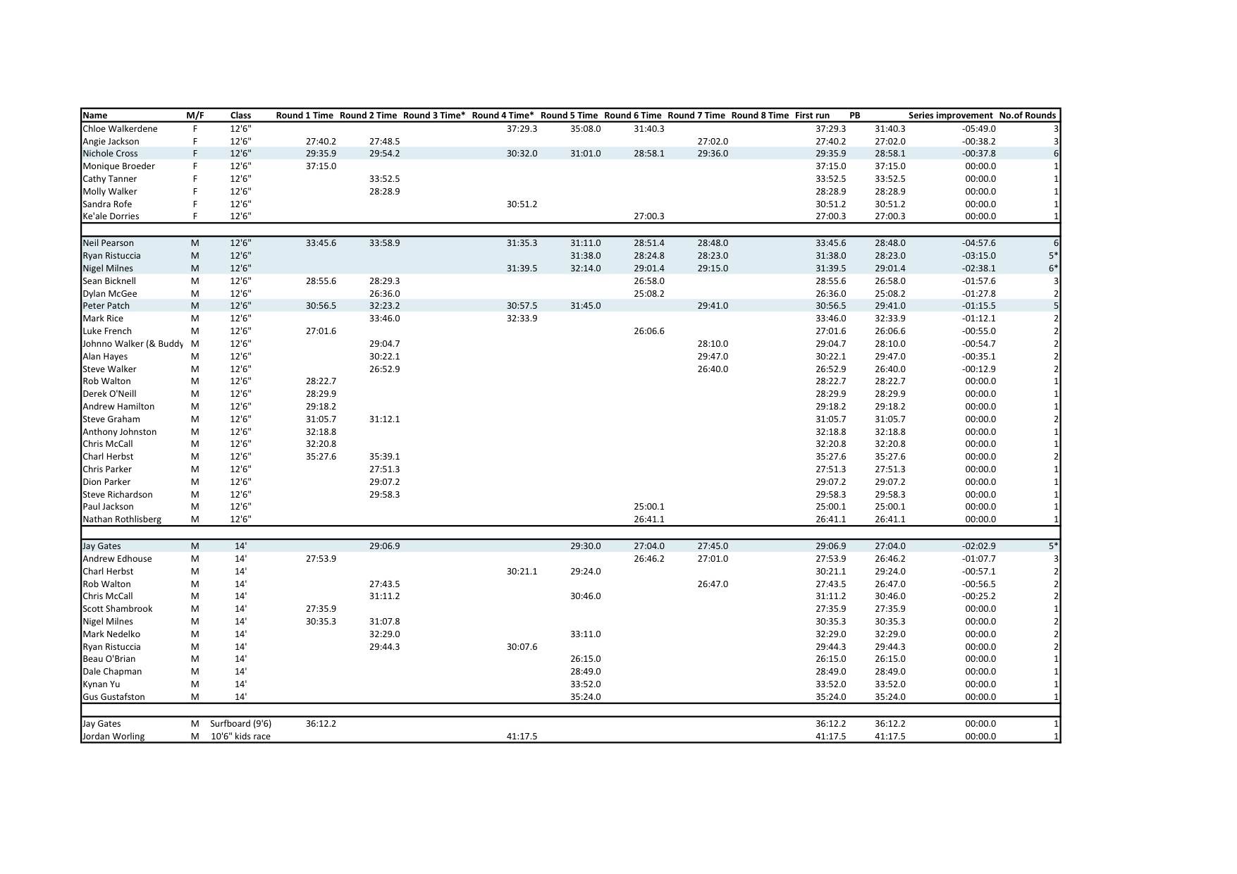 I've highlighted in blue those who are definitely eligible for series point so far (excluding weeks 3 and 8). If you have paddled in more than one board category throughout the series (eg. 14' and 12'6"), your 'improvement' is calculated only relative to each board class, but you're still eligible for prizes if you've attended 5 rounds in Total.