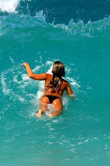 Alana Blanchard. Surfs better than most of us and not too hard on the eye either. Just don't mess with her 'brothers'........ You may have heard of the Wolfpak?