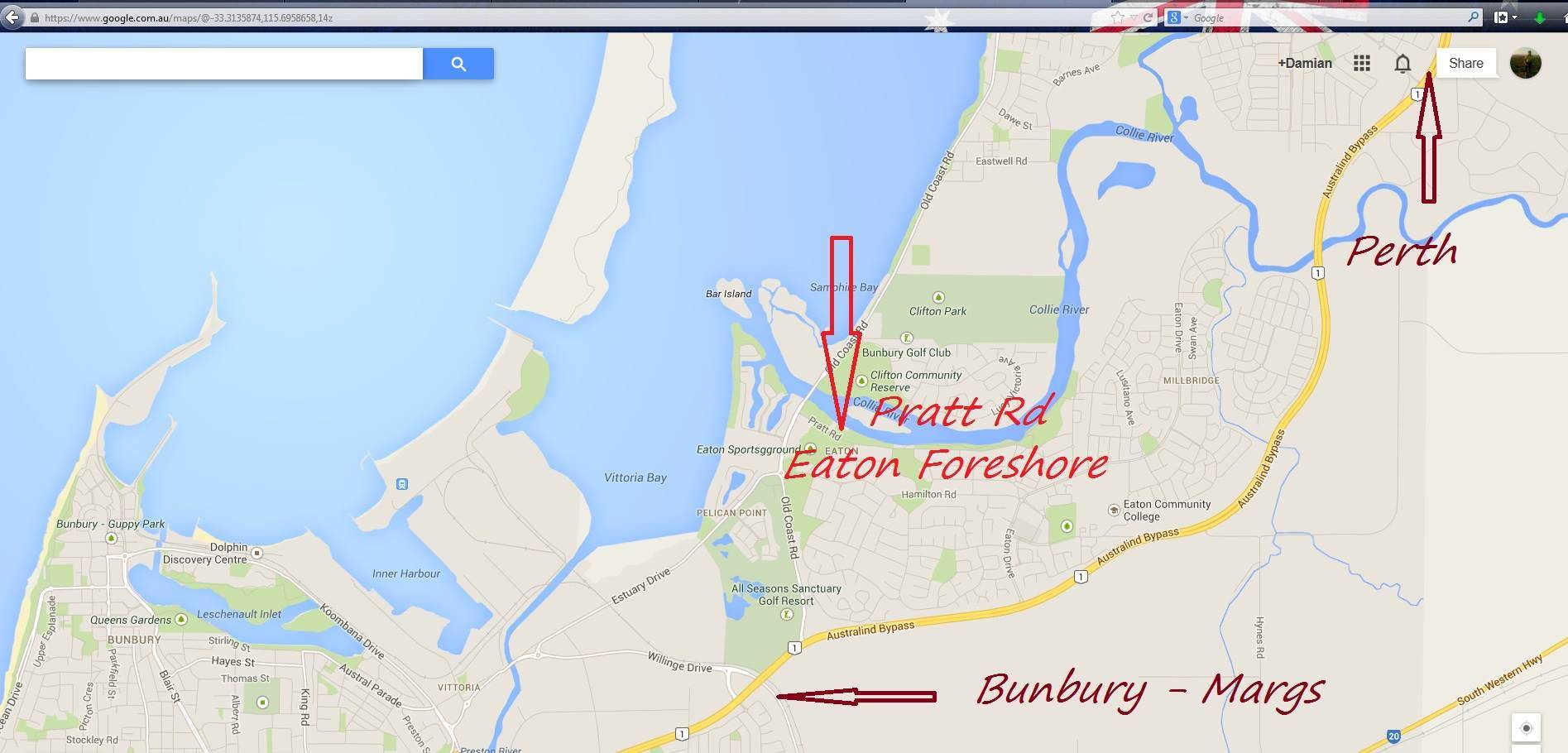 Pratt Road, Eaton. Just off the Old Coast Road on the south side of the Collie River Bridge.