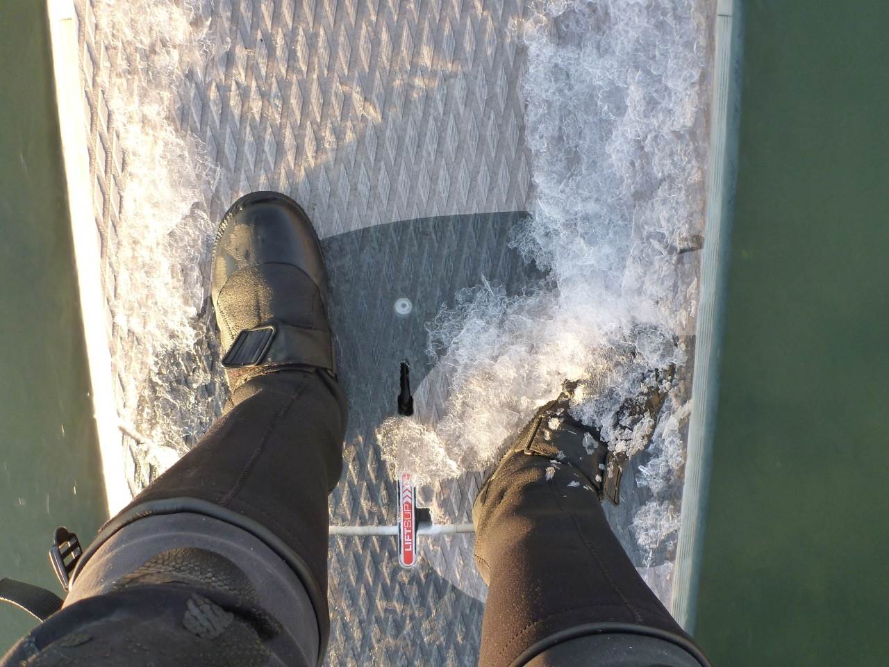 Your feet are stationary and ice piles up on them... so I use oversized, tall (dry launch) wetsuit boots with 2 layers of THICK wool socks