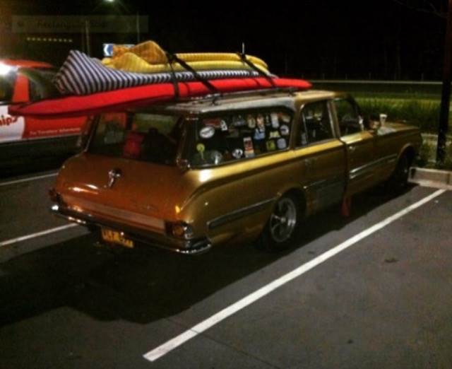 ,the old golden Val wagon,geez that board in the red covers a long one,must be about a 12 footer.He's got the Tasman mag wheels on it,same brand as mine on my wagon but different pattern.Bit of useless info for ya,The Tasman mag wheel was Australia's first available commercial mag wheel