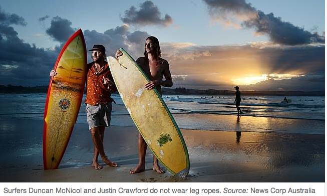 Surfers Duncan McNicol and Justin Crawford don't not wear leg ropes.