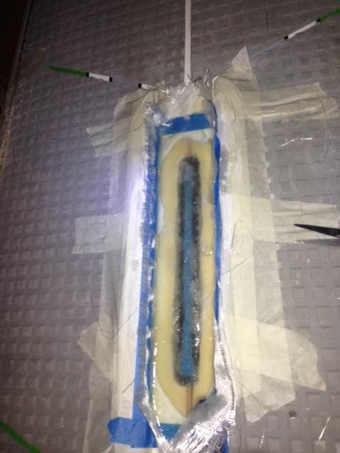 Resin and 6 layers of fibreglass were laid down, then sanded.