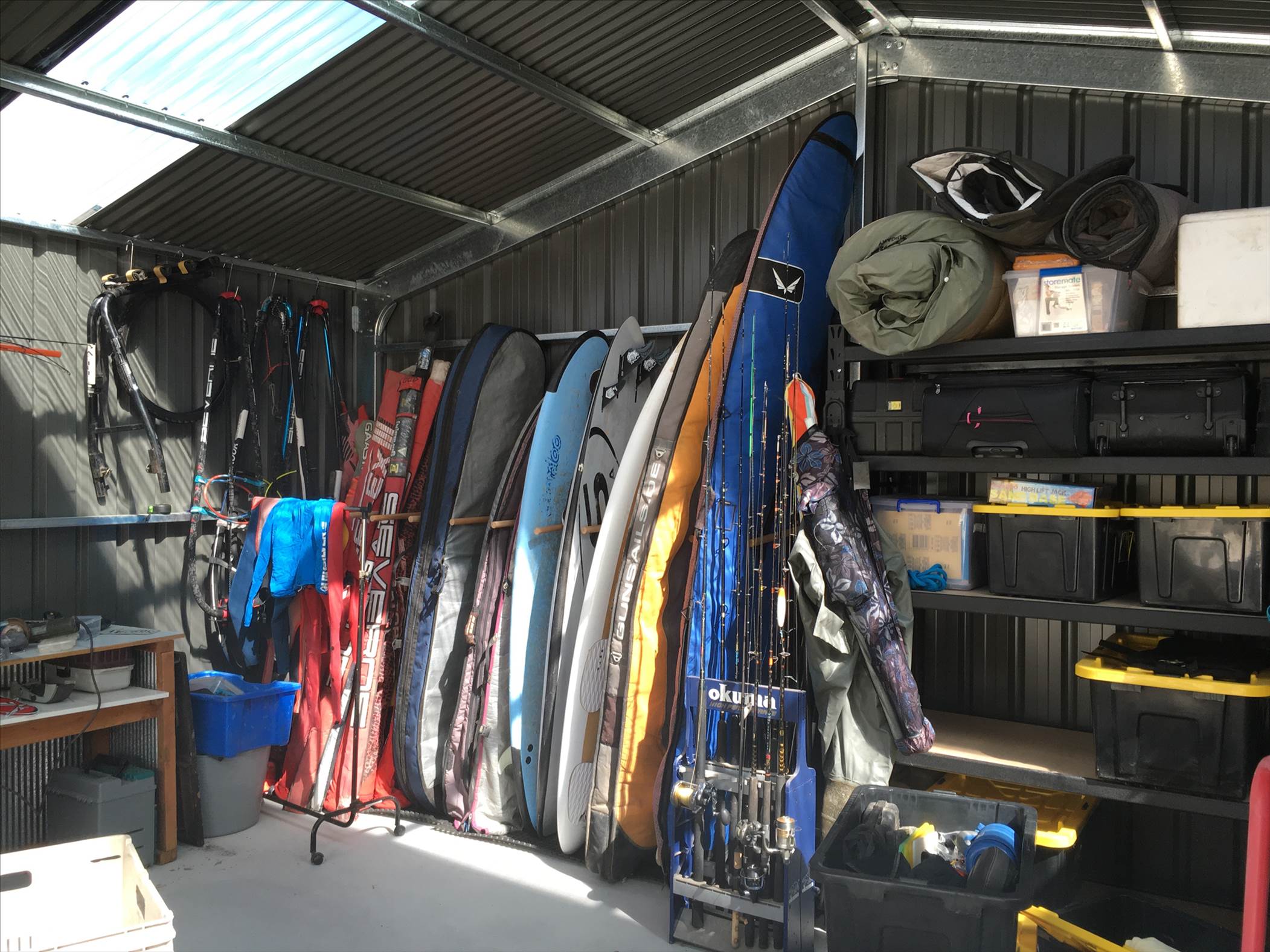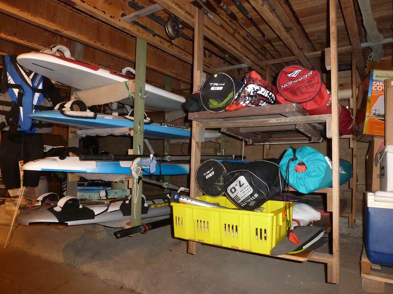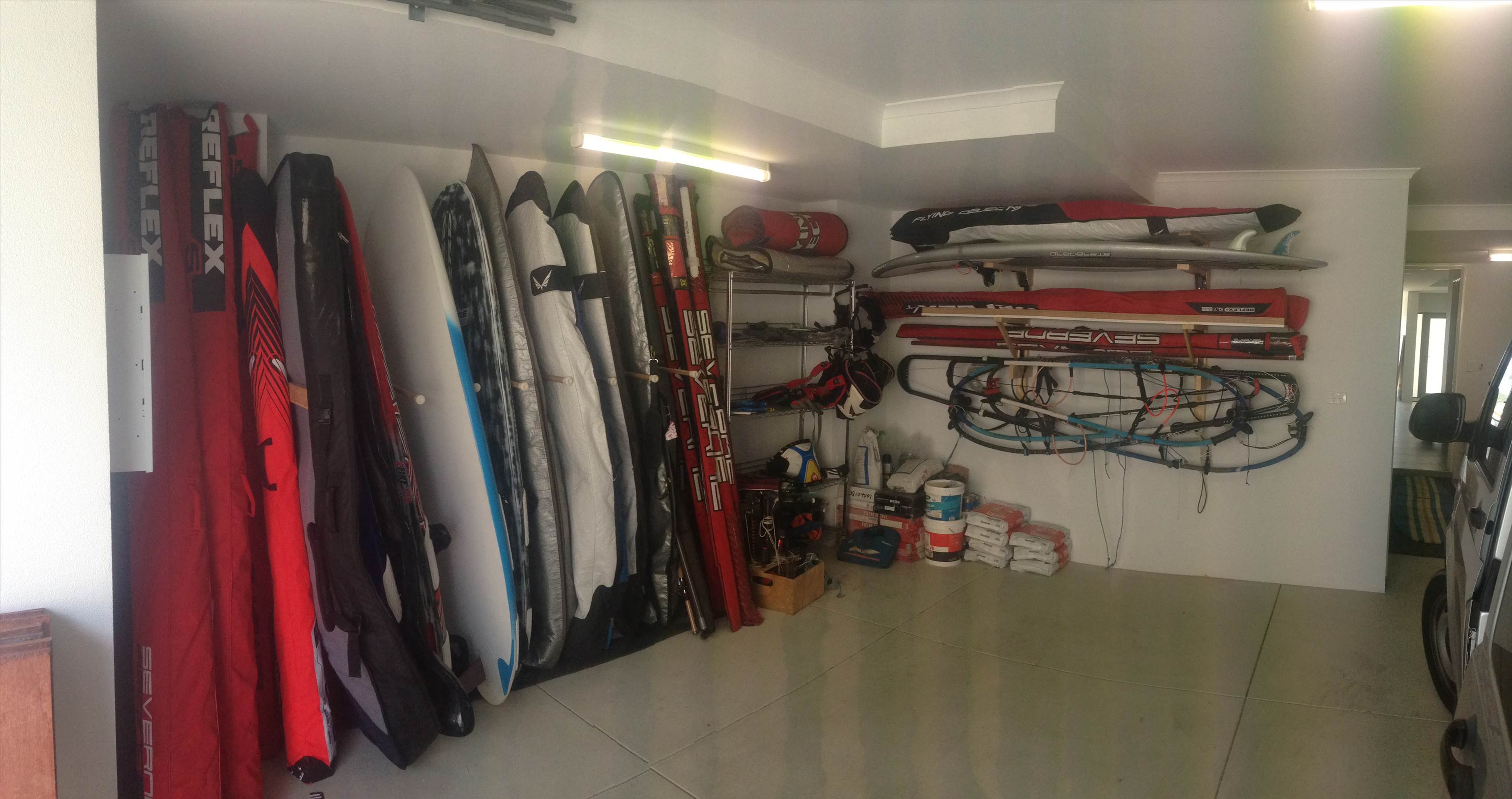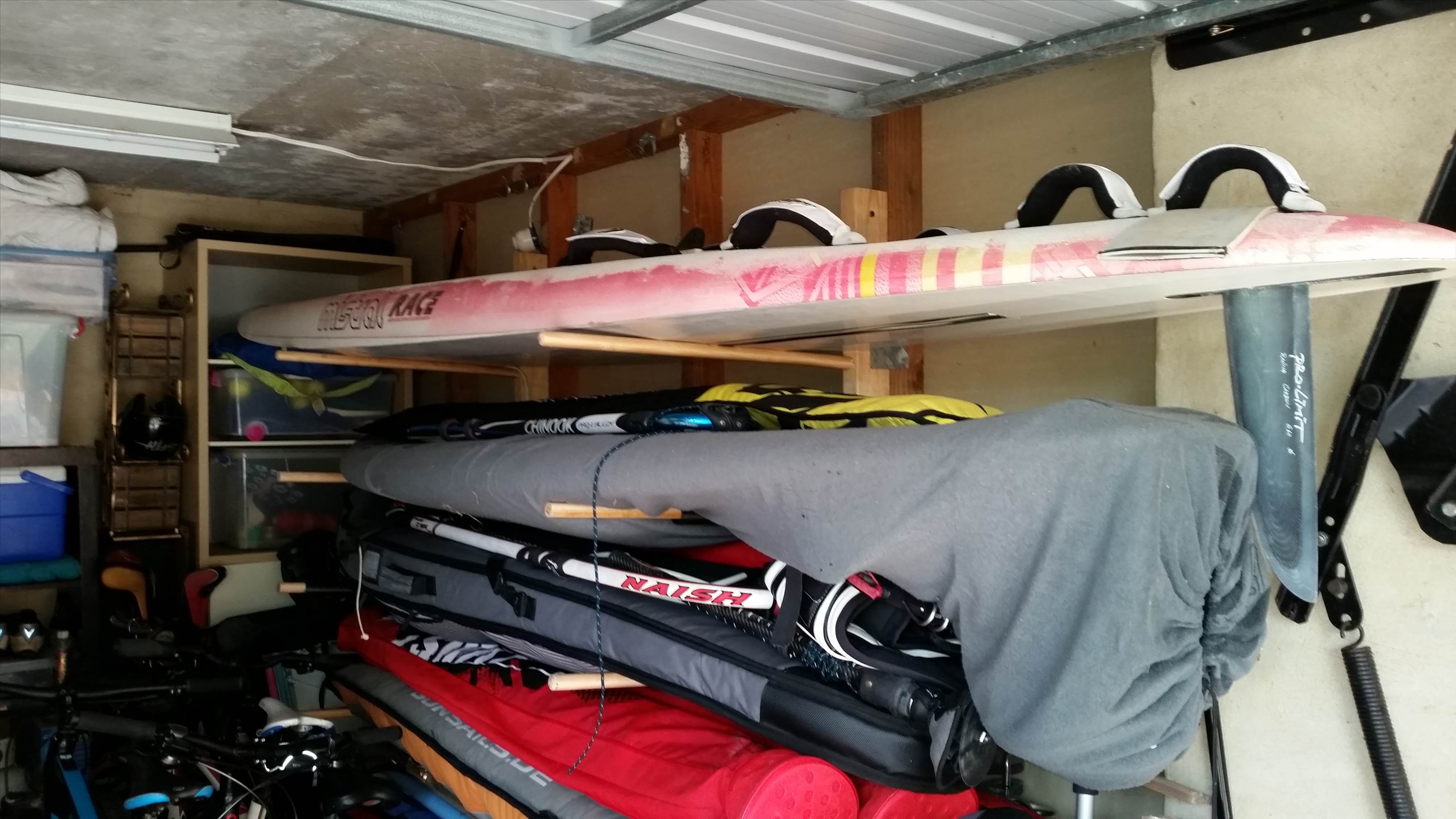 Since selling the kites I've been able to expand the windsurfing collection. Do like the vertical hangers for smaller boards and booms utilising wall space and still leaving plenty of room for car access.