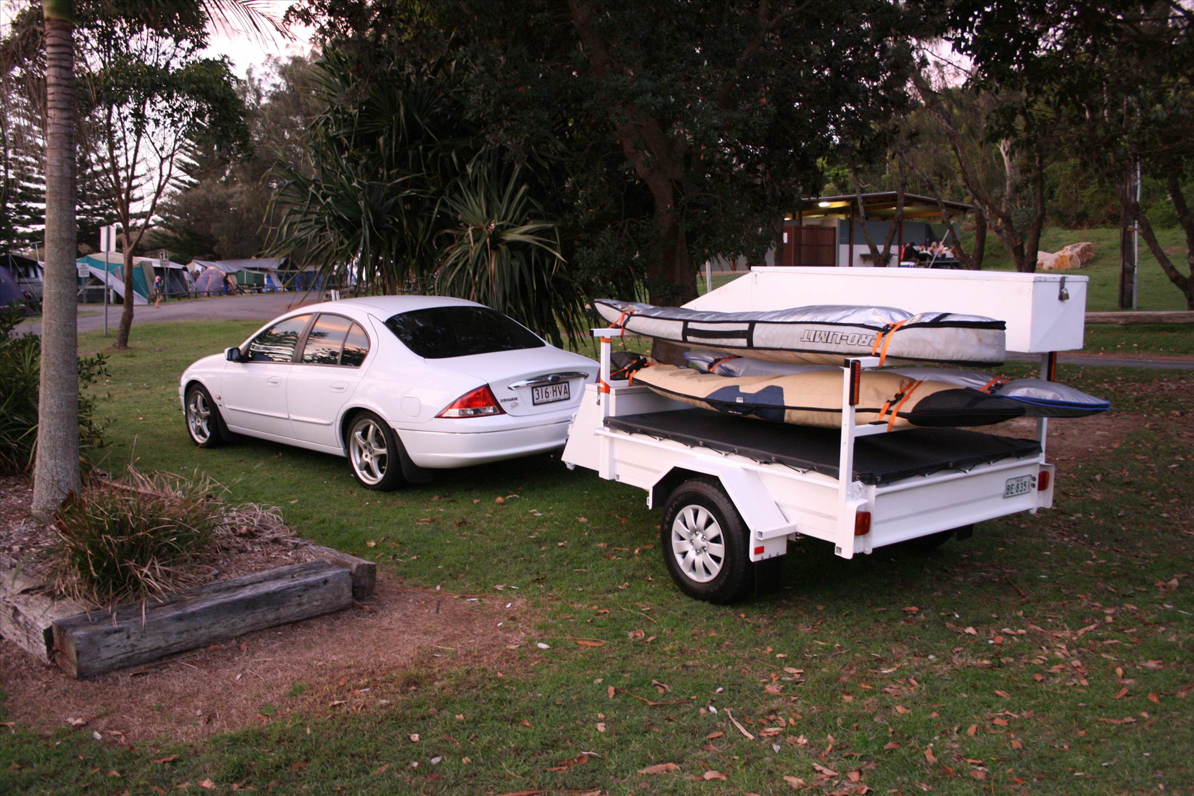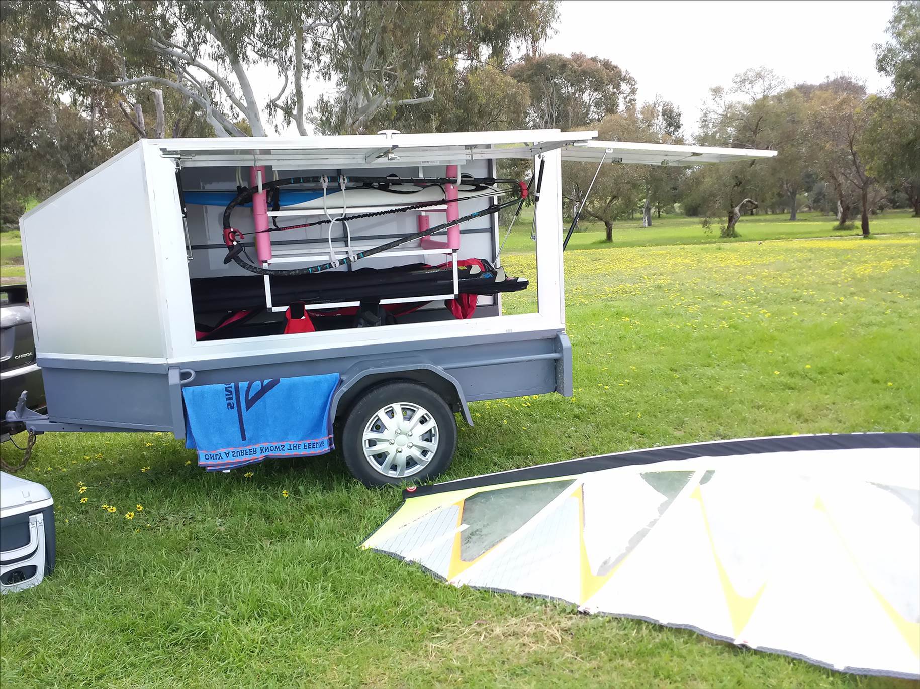 Getting a little sick of loading up the station wagon and having boards take up the passenger side front seat, booms and mast near touching the glove box and a tub of wet suits, extensions, harness, vest, gps, fins etc all sliding around in the back. And a little over un-loading the whole show at the end of the day too. So, I was thinking of going down the modified box trailer route. I have safe, dry storage for one, and was hoping to load it with 3 boards and half a dozen sails plus the usual tub of bits and pieces. So if anyone has any ideas, tips or tricks (and some pictures) of how they set up there box trailer, I'd be happy to hear (and see) them.![]()