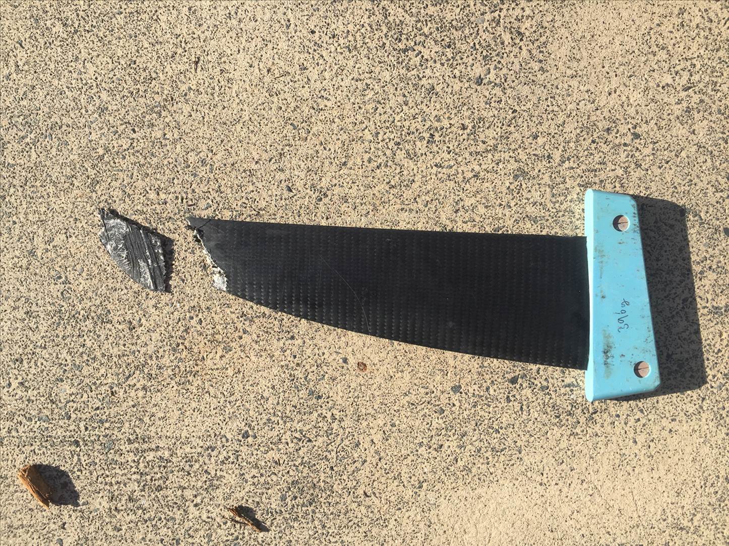 The broken piece remained attached but at right angles to the fin. It only completely separated once I'd removed the fin when de-rigging. What amazed me, was that I was able to plane back to the beach - which involved a 4km downhill run with 5 gybes, with no real apparent reduction in fin performance.