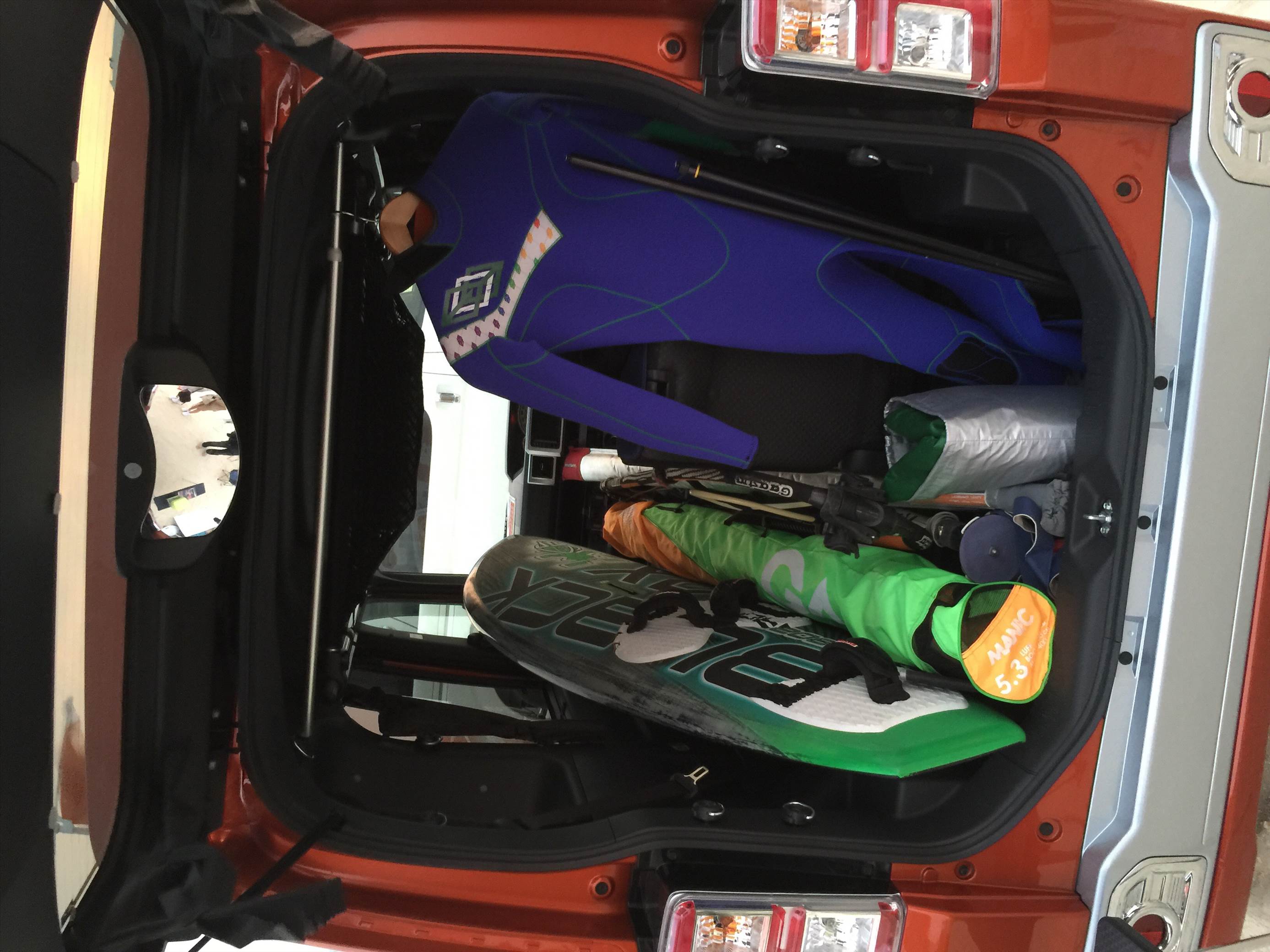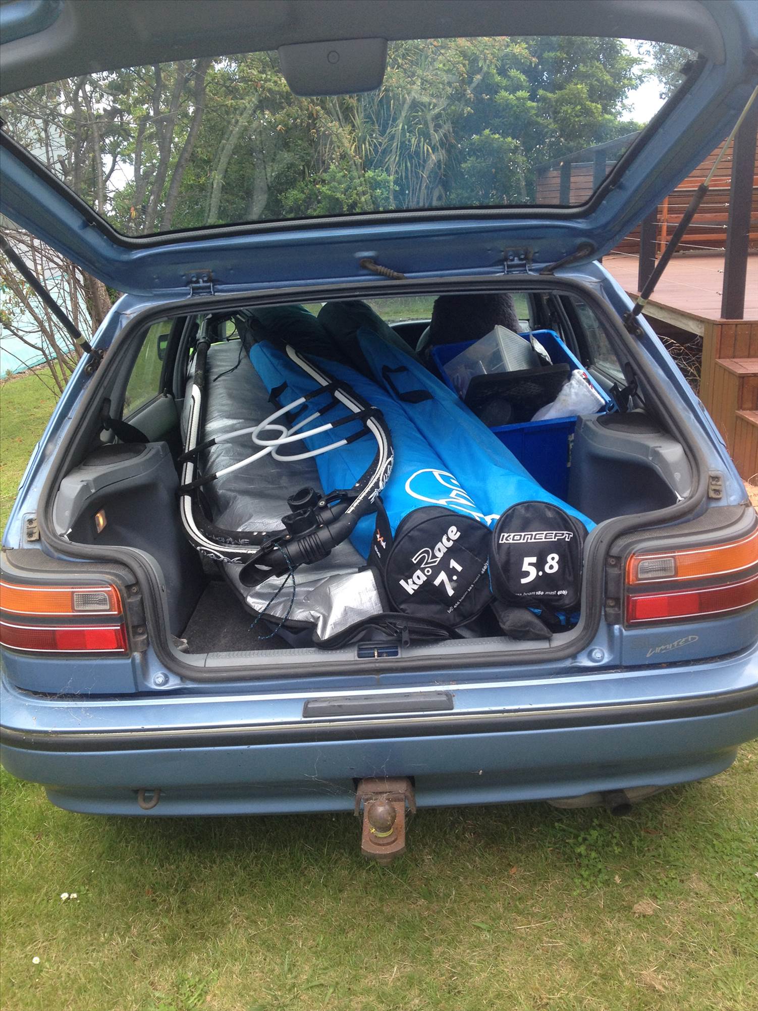 I can fit 5 kites, 4 kite boards and all the other gear, plus 4 people in my moms 1989 swift.
