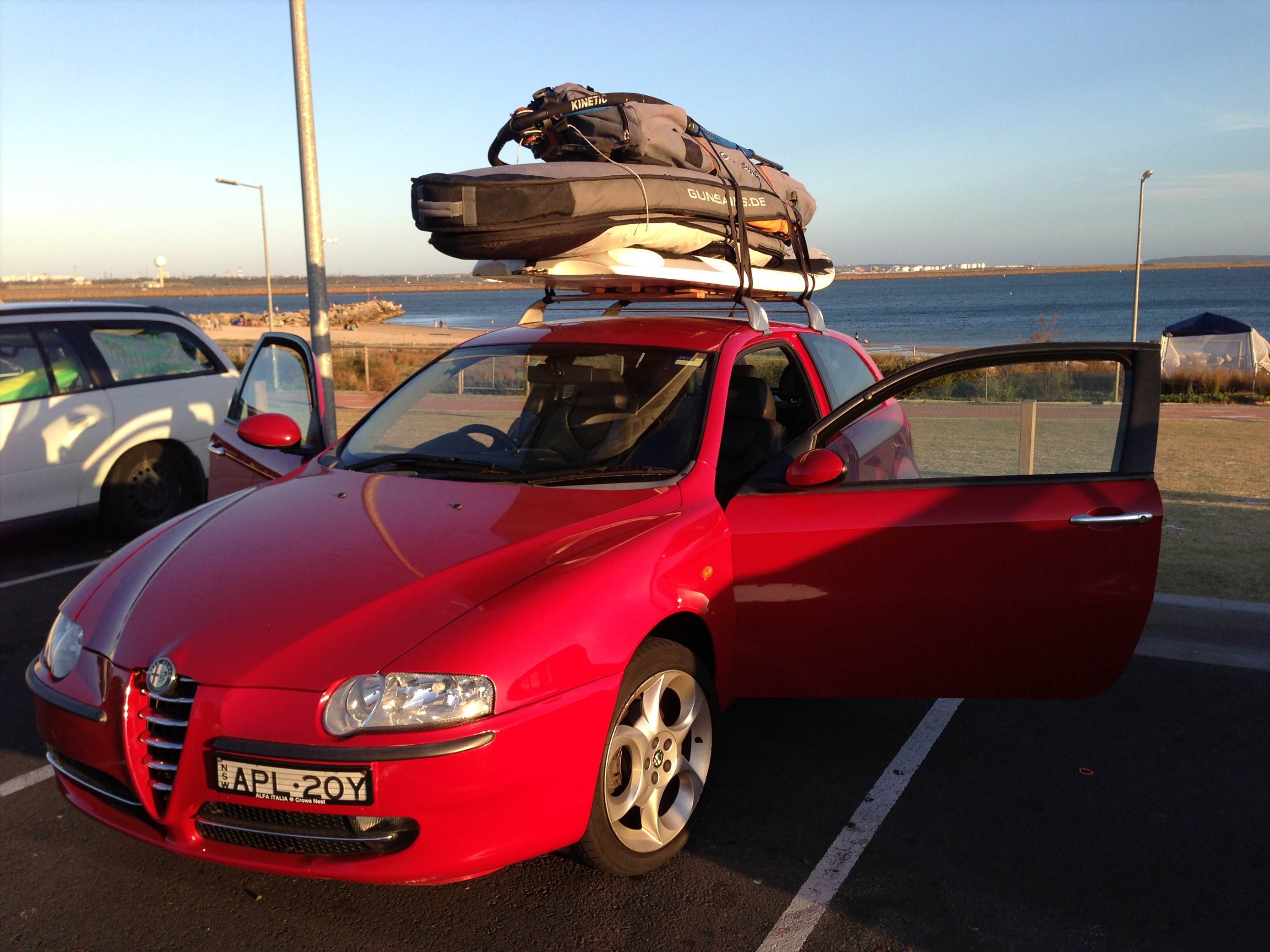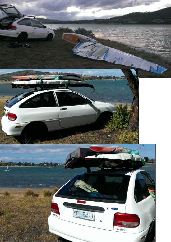 The Festiva is shown in the photos. The first photo was a session with all the gear in the car. The second and third photos show the setup when taking the family, with all the gear on the roof - 2 boards (SB Rio and then FSW on top) and a selection of masts, sails and booms in the long kit bag (also on the roof). To make sure the roof racks were secure I bolted them on through the roof. Room for 4 passengers!
