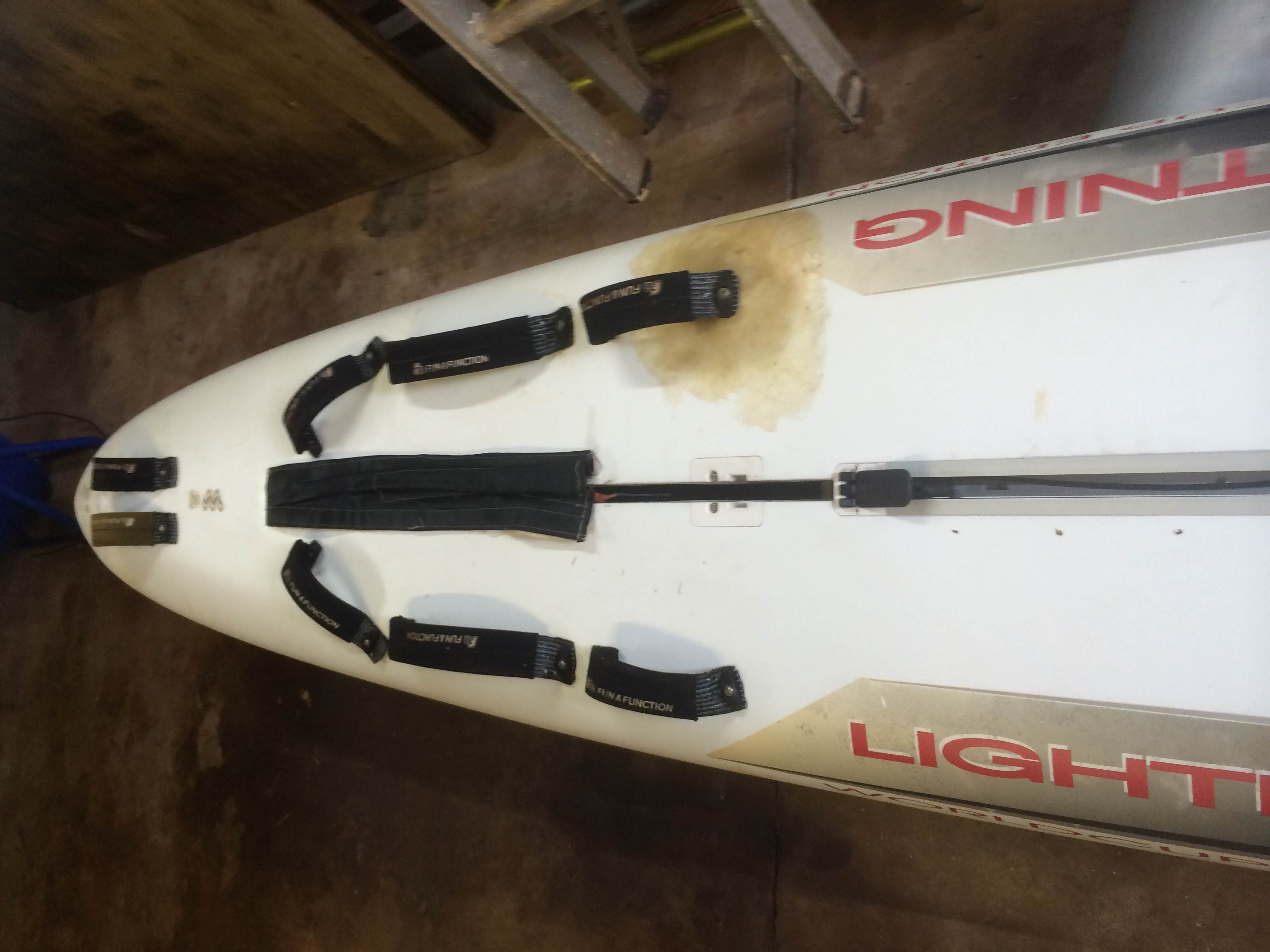 I've ground off the chop strand and got back to the basic board. What I have now is an obvious cavity and a loose foot plug. I've ground off the plastic f2 coating and exposed the epoxy fibreglass that the board is made of. This is what I was expecting as I had repaired a deck on a similar F2 Lightning.
