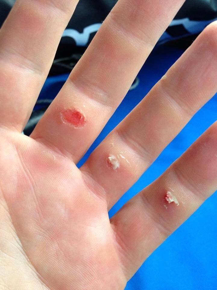 The worst thing is when I've developed some really nice thick callouses, then after a day in the water, I get a blister underneath the callous. So this massive chunk of skin a few mm thick comes off. Gotta love the pain when I put isopropyl alcohol on the wound to HTFU.
