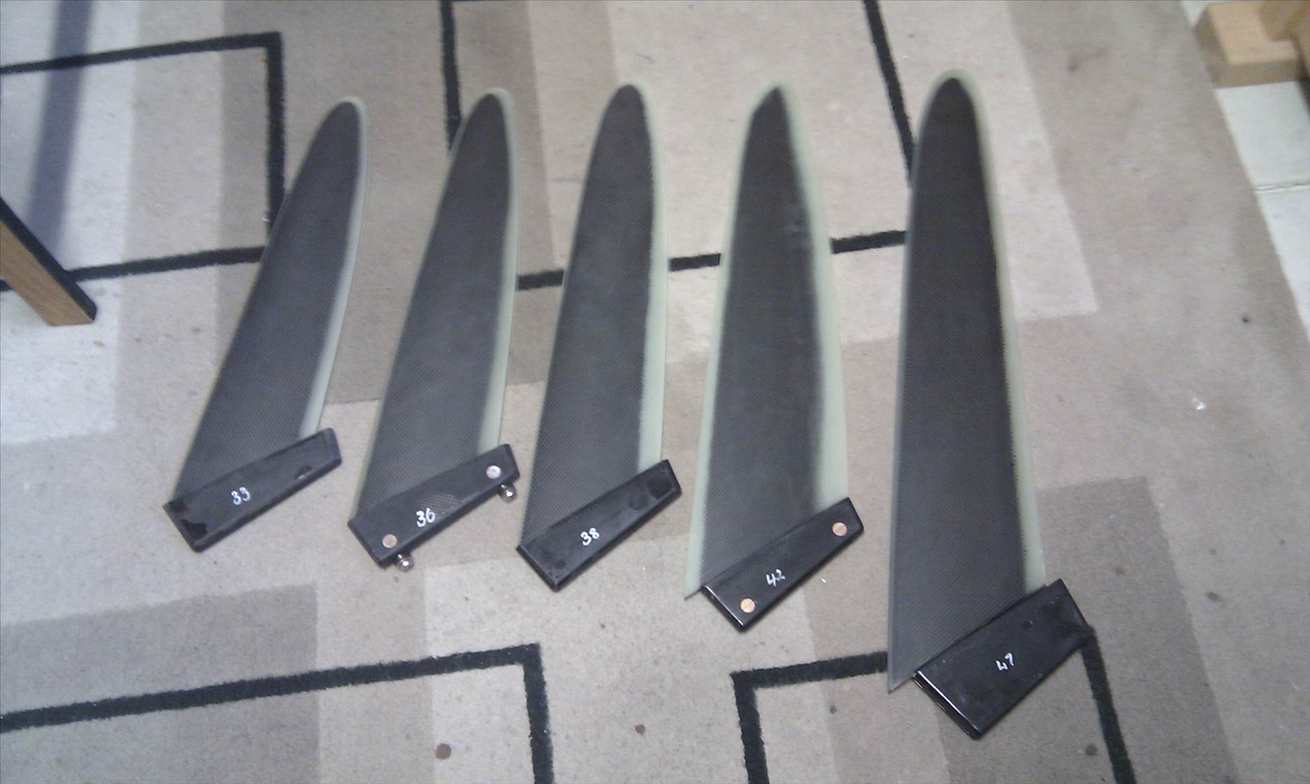 I've laminated some carbon onto each side of my fins, which stiffens them without adding too much weight. It also thickens the foil and provides more lift when the most I can really get away in rake is 40 degrees. The Pepeweed collection: