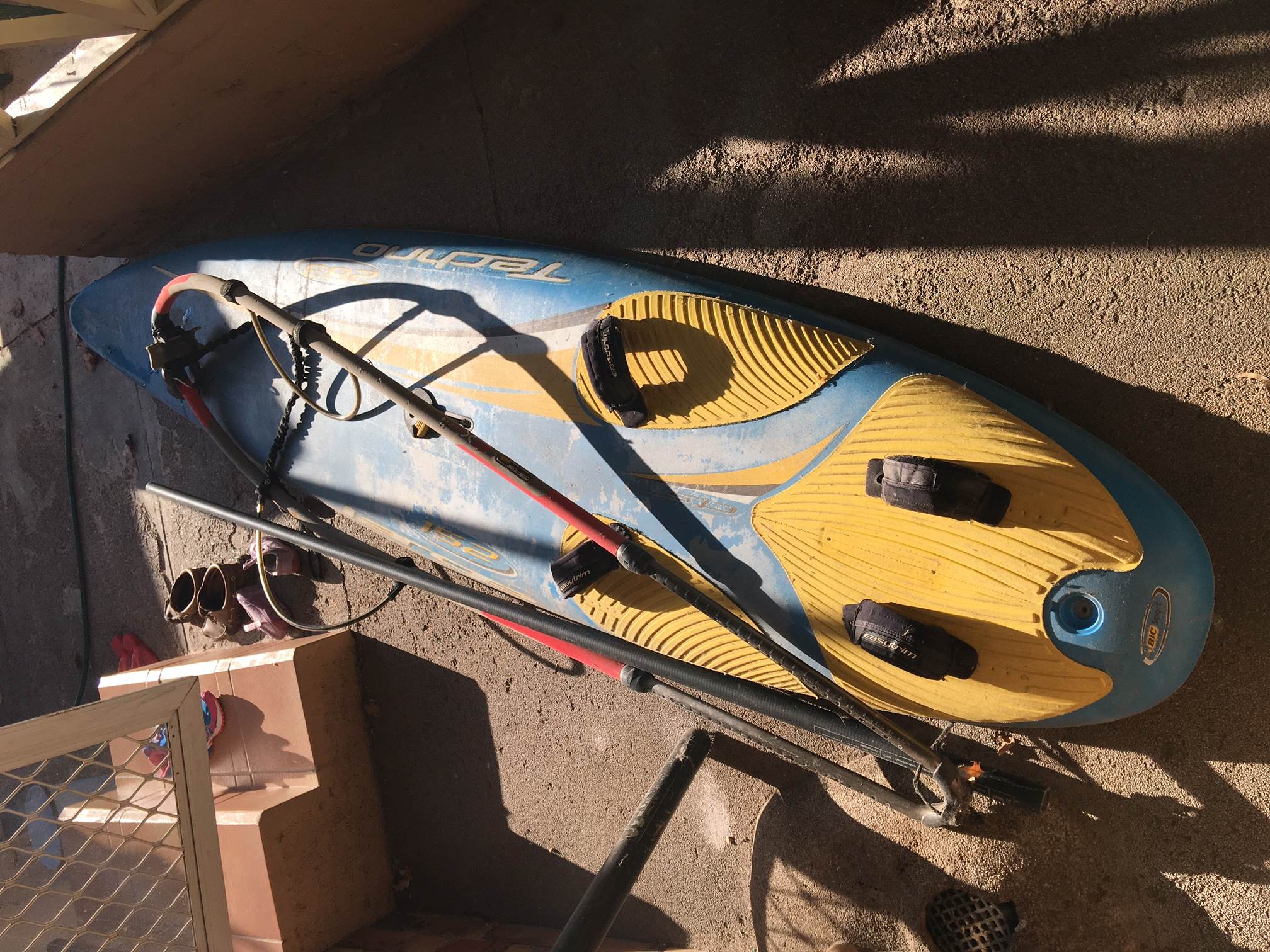 Bic techno 152 + assorted gear available: sail bags (sails are ripped- no idea if fixable); mast; spare fin; harness.